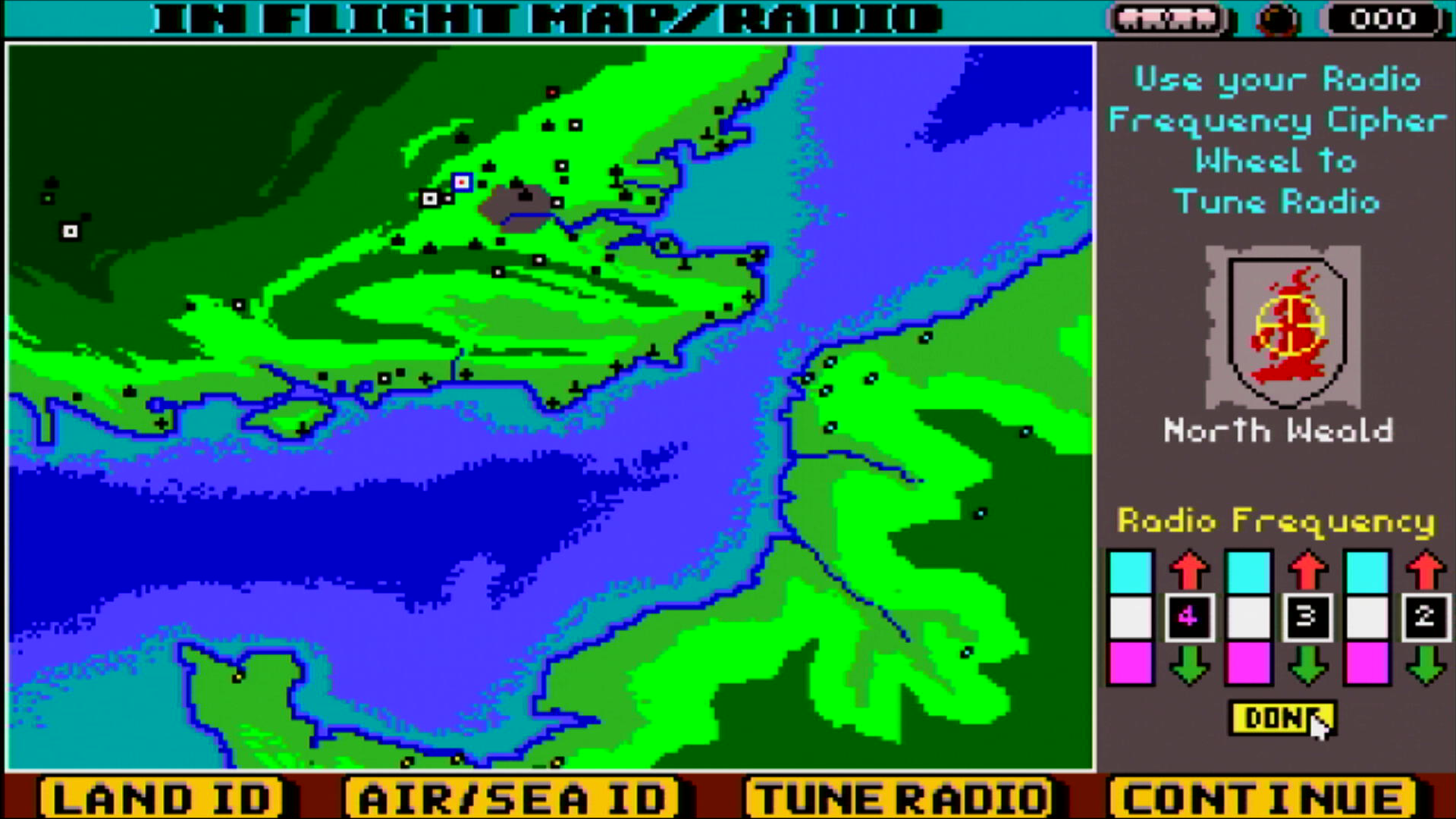 The game has a subtle form of copy protection. You can play the game, and even begin a mission. At the bottom of the screen, a message will appear stating 'Tune Your Radio. Press 'M'. Before long, the flight will not be able to continue until you have tuned your radio. Pressing 'M' or choosing 'Tune Radio' from the In-Flight Map/Radio screen will display the map and on the right-hand side your are prompted to tune your radio frequency cypher wheel. You will see a shield and a name beneath it.