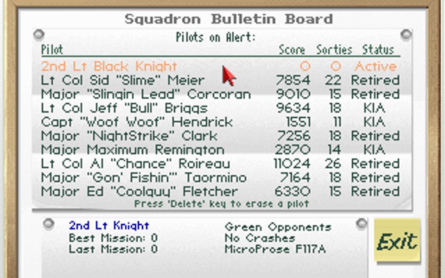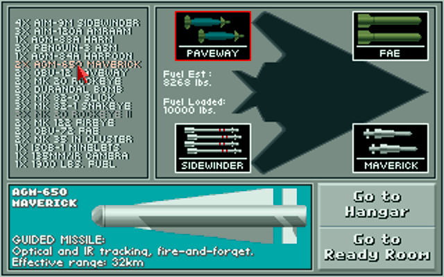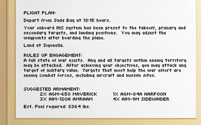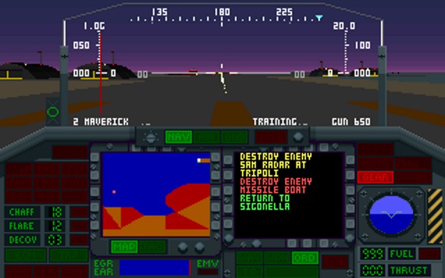 If it ain't broke, don't fix it. I'm sure this game's developers were thinking this, as the game takes everything that 'just worked' from its predecessors, and improved on it. F-117A is a great entry-level flight simulation with the interesting added focus on avoidance of trouble that you don't get with other flight simulators of the time. The 256-colour graphics really were beautiful in 1991, and somehow, despite a lot of sorties being at night, the game still provided great eye candy, with buildings and structures that pertained to the region you were in. F-117A is, in my opinion, the pinnacle of the MicroProse flight sims in the 80s and 90s.