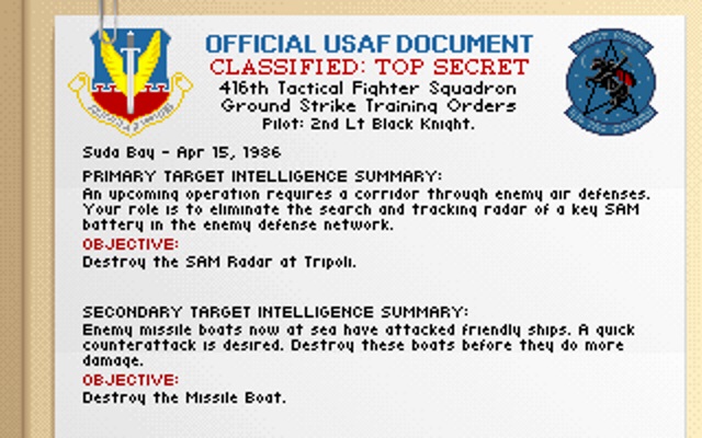 | Playable Demo | (unknown) | Restricted to playing 2 missions in the Libya theatre only. The player's craft takes no damage in training mode (ALT-T). The map shows all 9 theatres that will be available in the full release. |