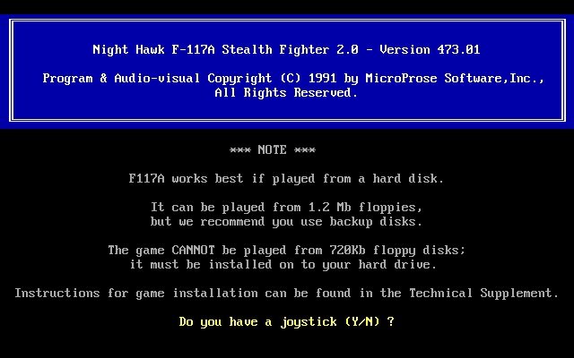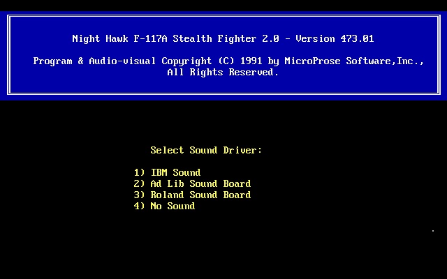 The game comes with a setup program, SETUP.EXE, although running the F117.COM file to start the game automatically takes you through these options each time. Running SETUP.EXE does not write to any batch file or configuration file, so it's assumed that F117.COM simply calls SETUP.EXE to prompt you for your configuration, and then loads the main game based on what you've chosen.