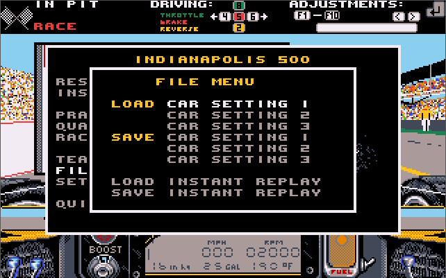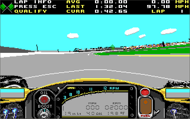You typically start with the 'Practice' option, which sees only you on the circuit. You can use this to tailor your vehicle's setup properly, before entering 'Qualify'. This comprises 4 laps to determine your starting position for the main race. The race itself pits you against 32 computer-controlled cars, which accurately mimic the starting line-up from the 1989 Indianapolis 500 race, with you taking car #17's place.