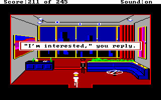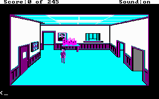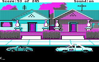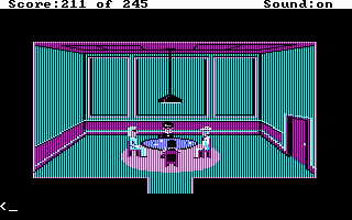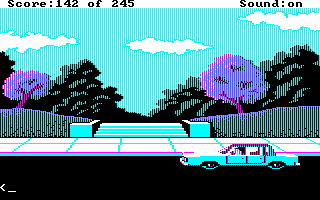 My version of this game has AGI interpreter version 2.917 (the most up-to-date interpreter released for this game), and by default it runs in EGA graphics mode. Running with the -c option worked well. -h wasn't tested as it requires a TTL (digital signal) monitor. -v I hoped would work but displayed corrupted EGA graphics.