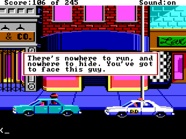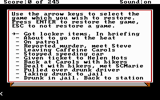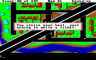 Perhaps where the game is let down, and this is common for the other AGI games, is the almost complete lack of sound during gameplay. There are a few bleeps and bloops, but it is otherwise silent. Despite this, Police Quest is still a lovable title, and one that must be played if you've not done so before. If 16-colour EGA or text entry isn't your thing, try the remastered version that provided a point-and-click interface and glorious 256-colour VGA graphics.