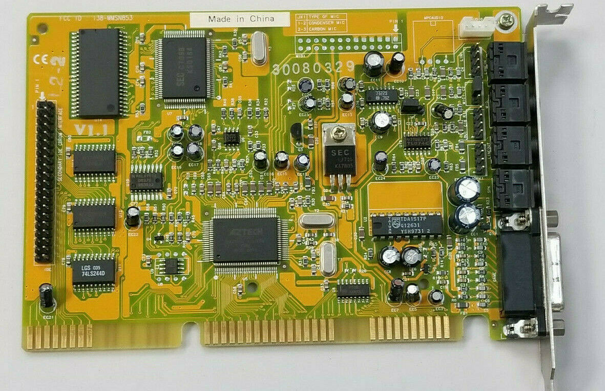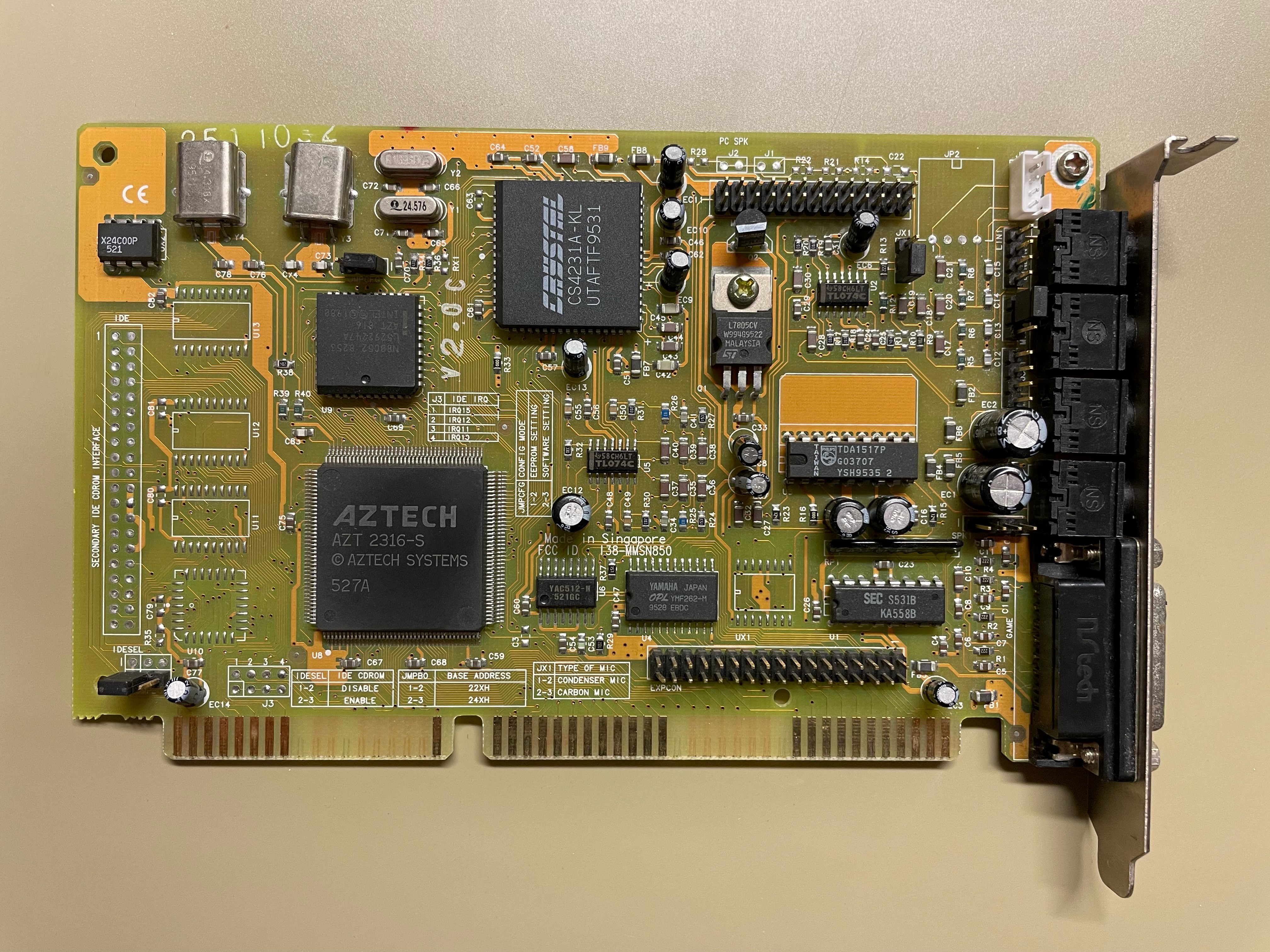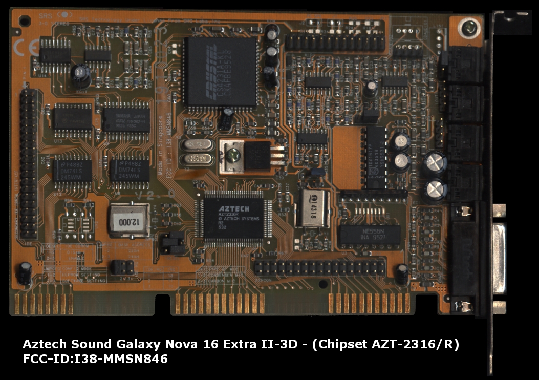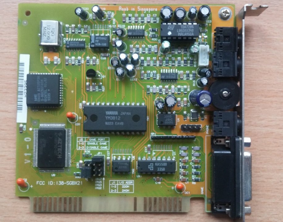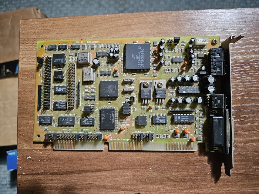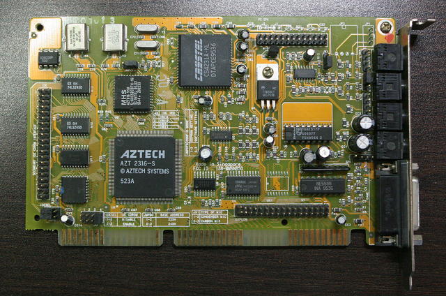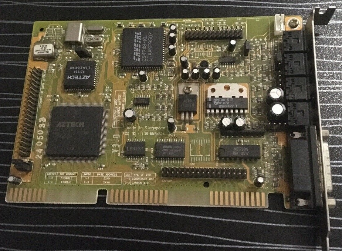 This is one of the last cards produced by Aztech that is *not* PnP. It has no wavetable header since it has embedded wavetable support in the form of the Aztech AZ3320, which is a rebranded SEC (Samsung) 0164 and a 1 MB ROM that holds the samples.