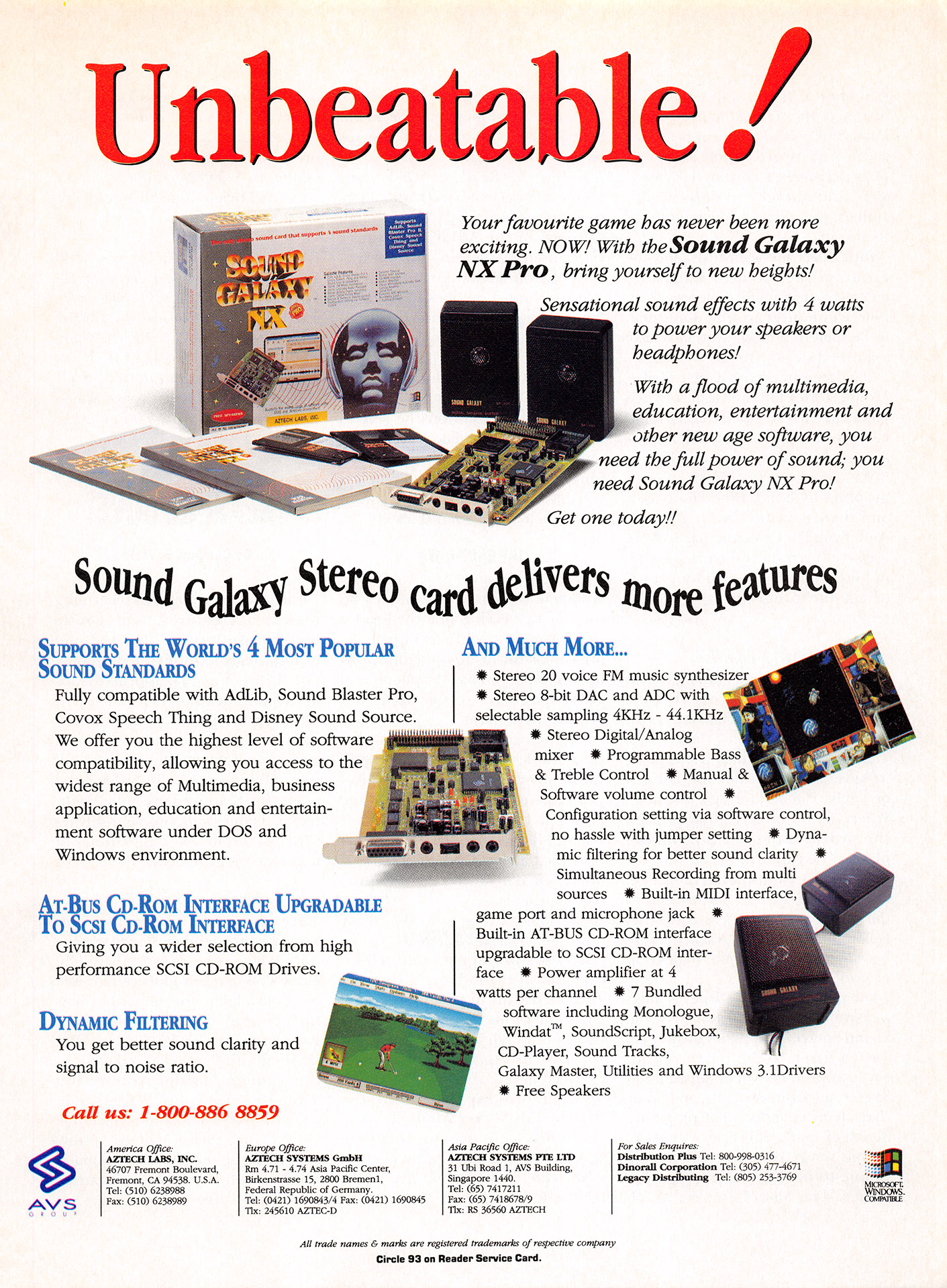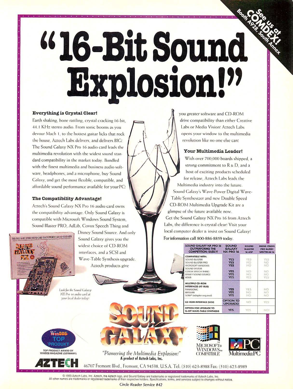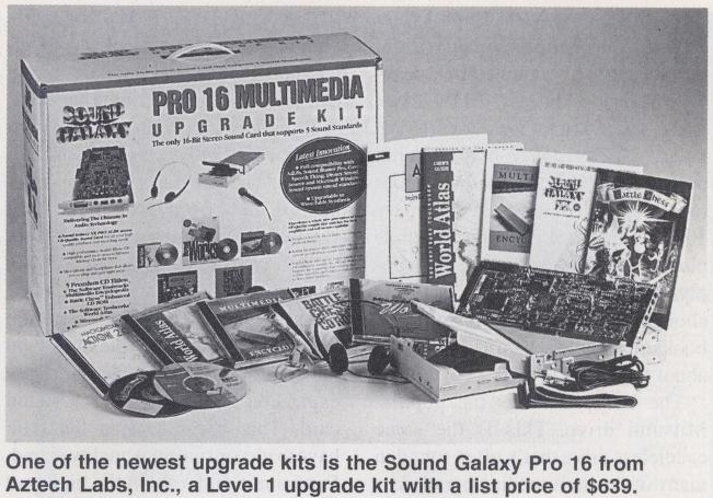"One of the newest upgrade kits we examined is the Sound Galaxy Pro 16 from Aztech Labs, Inc. A [MPC] Level 1 upgrade kit with a list price of $639 (which should translate to a street price of about $475 or so), it includes an internal [Mitsumi] CD-ROM drive, the Sound Galaxy NX Pro 16 sound card, lots of software*, and even a set of earphones and a microphone. Just about everything you need to get started using and even creating your own multimedia applications." PC Upgrade Magazine Vol.2, No.5