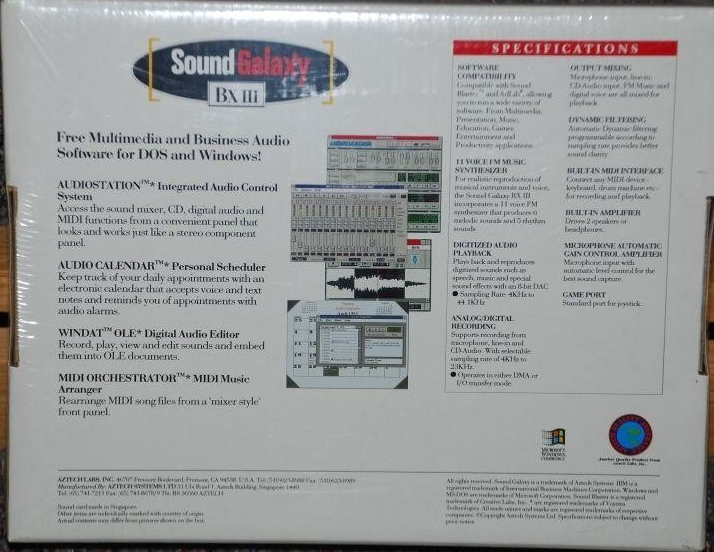 Aztech Labs started in 1986 as a manufacturer of disk drives and modems. They arrived slightly late to the home computer audio market, but became very successful in this area, primarily because they formed strong partnerships with the big box PC-compatible OEMs (Original Equipment Manufacturers) and peripheral manufacturers such as Packard Bell, Reveal, Trust & HP.