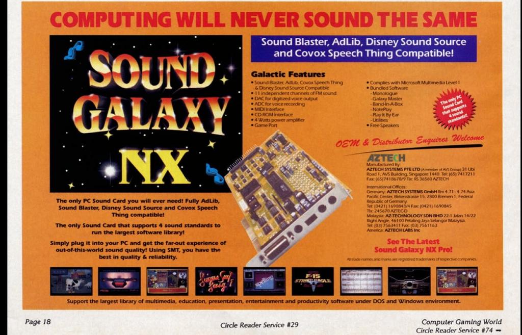 "The most striking thing about the Sound Galaxy NX is that its manufacturer, Aztech Systems, claims that it emulates just about every other popular low-cost card on the market. The systems it mimics are Ad Lib, Sound Blaster, Covox Speech Thing, and Disney Sound Source. That's an impressive line-up as far as the dedicated games player is concerned because it amounts to this particular card being supported by just about every PC game released in the last couple of years. Performance wise, this board produced good, clear sounds in all of its modes, although I did occasionally notice some interference, especially at high volumes." PC Review, November 1992