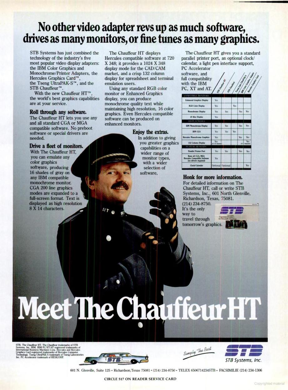 The Chauffeur HT was a Hercules-compatible card that supported for the first time a resolution of 1056 x 352, ideal for a 132-character wide display in text modes. It came with drivers for Microsoft Windows, AutoCAD, Lotus 1-2-3 and Lotus Symphony.