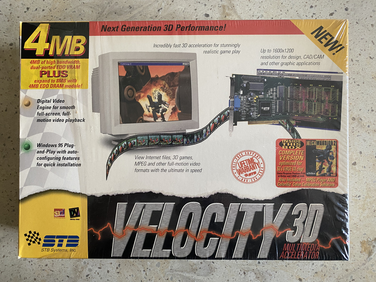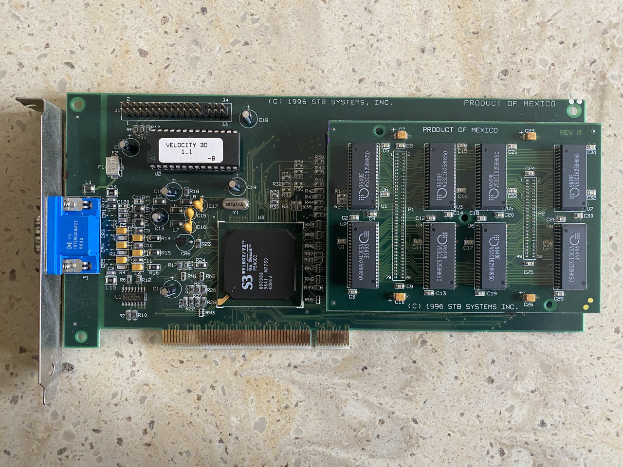 The Velocity 3D was STB Systems' card based around the S3 ViRGE/VX chipset. The card in the pic above has the optional 4 MB DRAM memory upgrade installed.