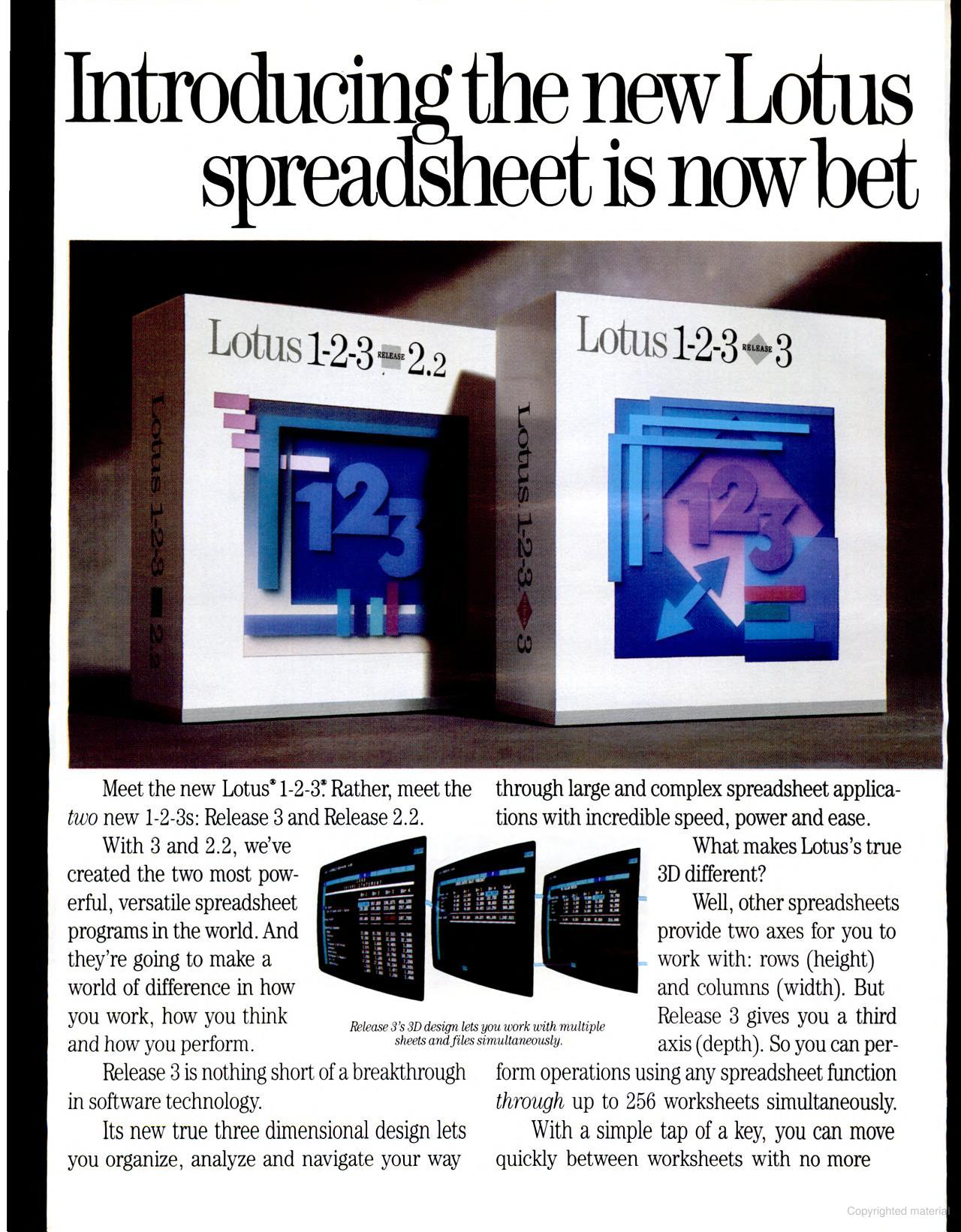 While both versions added new features, they weren't aligned with each other. Release 3 offered 3D worksheets (a stack of connected worksheets in the same file), links to external databases like dBase III, and the ability to see a graph and worksheet simultaneously. With its better memory management it could theoretically handle 256 worksheets at once, with each the size of the single worksheet that Release 2.2 can use, at 8,192 rows by 256 columns. Release 2.2 offered none of these features, but did come bundled with Allways, an add-in that could produce output every bit as attractive as anything that Excel could do. With this, Release 2.2 could produce professional-looking output that Release 3 could not. It still contained the old "PrintGraph", though Allways superceded this acros the board. Setting Sheets in Release 2.2 gave you an overall view of relevant settings for a given function - this too was lacking in Release 3, though this feature would be added in a later release.