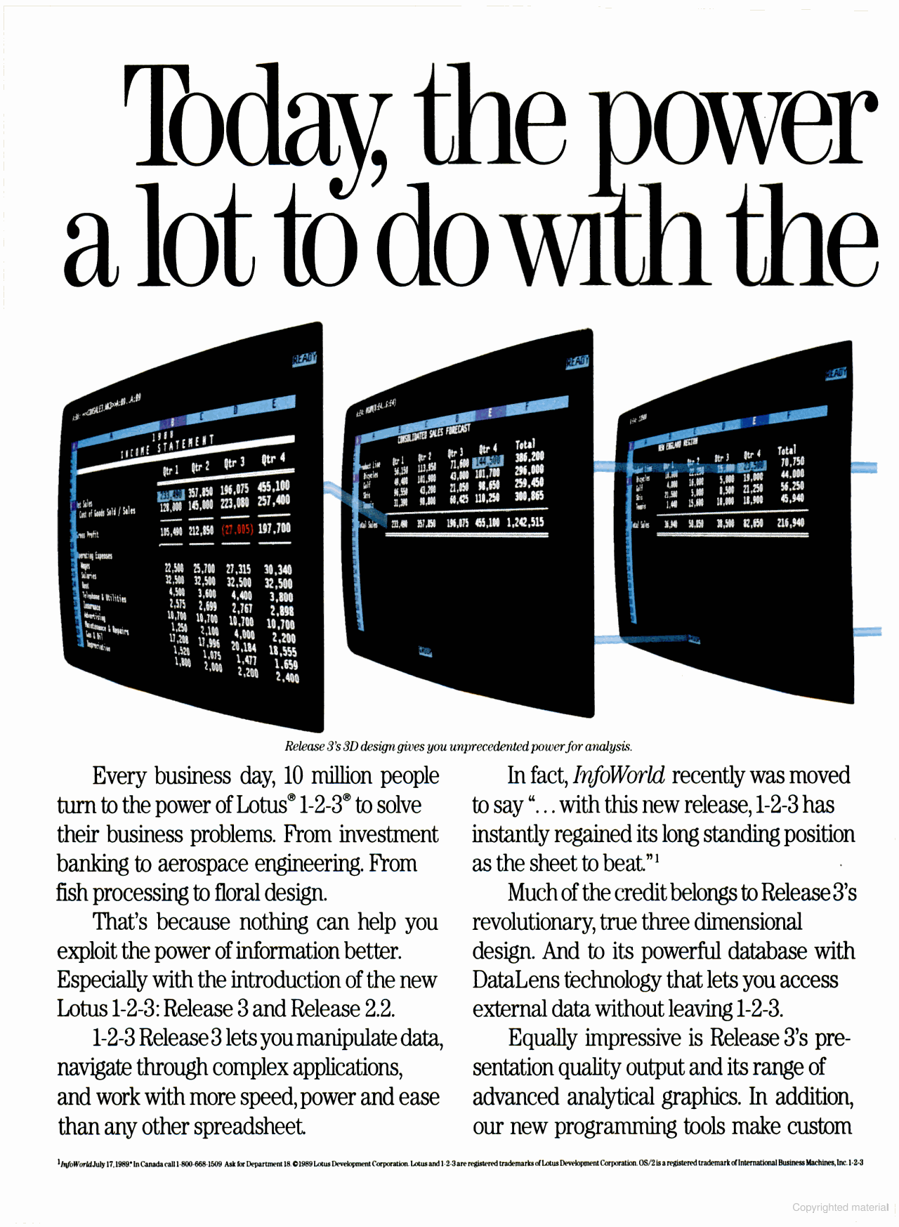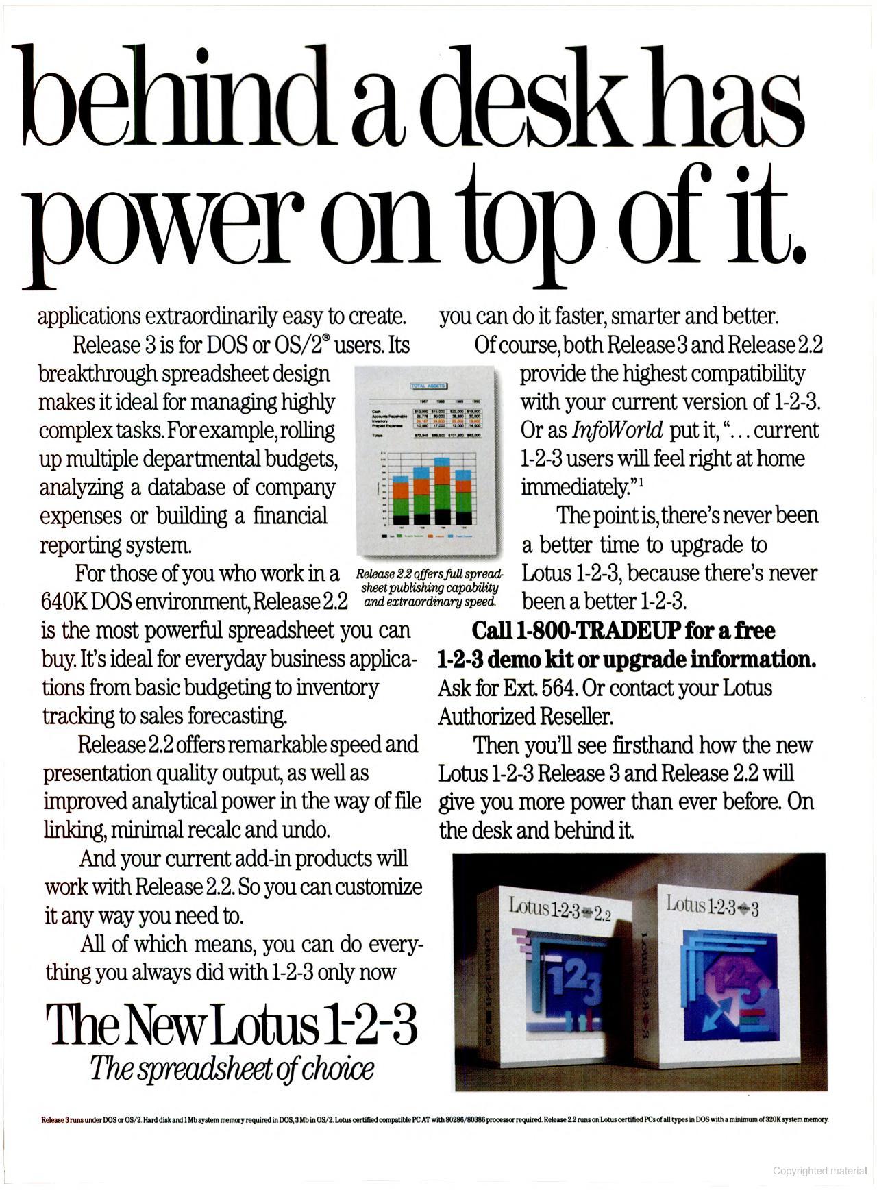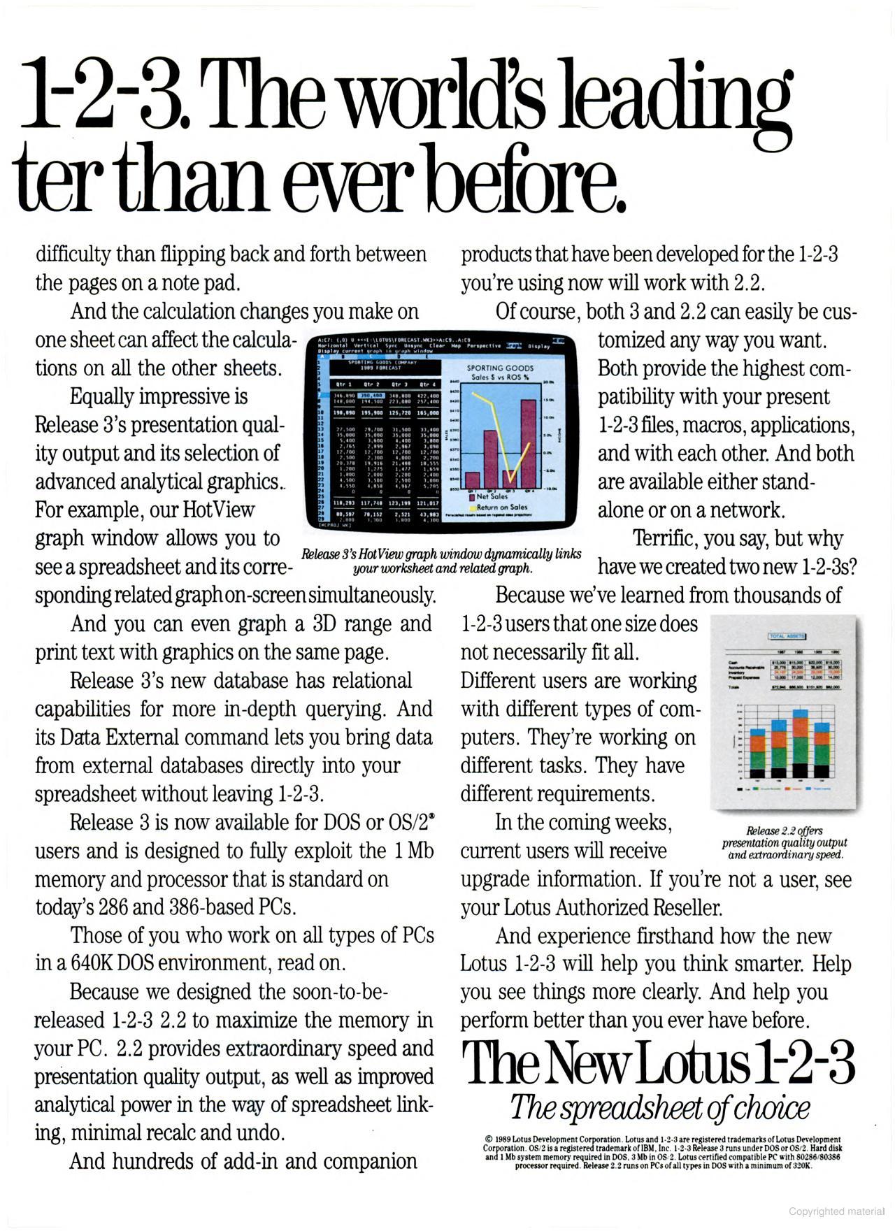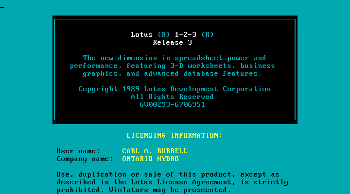 In January 1989, Lotus 1-2-3 Release 2.01 was the top-selling software product, followed by WordPerfect 5 and Norton Utilities Advanced Edition 4.5. They put together a "Value Pack" in late 1988 to help drive sales until Release 3 was ready. This was a handful of utilities which, among other things, removed copy protection and provided a 43-line display on EGA adapters.