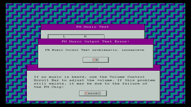 I ran into the problem above only on the FM Music Output test - sometimes it would play just a lot of hissing and crackling. This was caused by the PC running too fast (I have this on an AMD K6-2 533 MHz as it's the board I have running right now). I did some tweaks in the BIOS and brought the speed down to 166 MHz but the problem continued. Bear in mind that in 1993 a typical PC ran a 486DX-33 or possibly a high-end machine with one of the new DX2s or even a Pentium 60. So in summary, this card is not very tolerant running in an out-of-spec machine. I then swapped out the K6-2 for my trusty Pentium MMX 233 which has a lot more flexibility when used with the SetMul utility (see my separate article on Creating a DOS gaming PC). Running using the 'medium.bat' batch file, this brought the system performance down to the just a bit faster than a 486DX-33.
