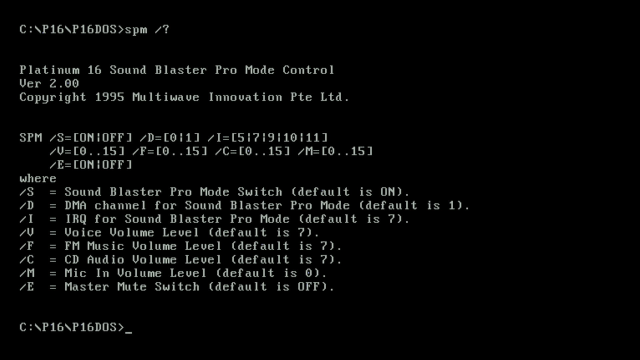 I mentioned the default port address and IRQs in part 1 - you can configure these two via jumpers on the card. By default the Sound Blaster Pro portion uses IRQ 7 and DMA channel 1 and Windows Sound System portion uses IRQ 11 and DMA channel 3. All of these can be reconfigured through the SPM utility, and these are persisted after reboot with the necessary SET BLASTER= line and SPM utility auto-started to use the settings you've chosen. SPM stores its settings in C:\P16\P16DOS\DOSSND.INI.