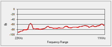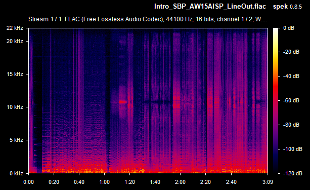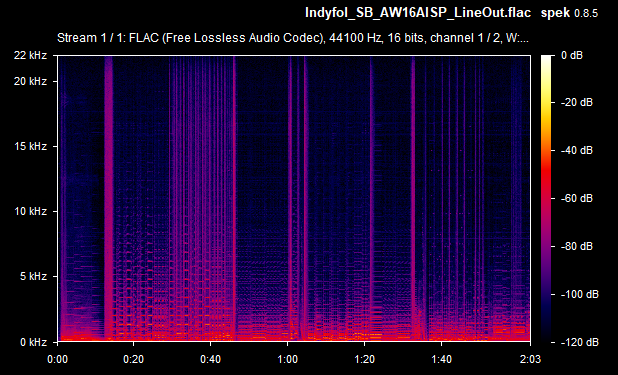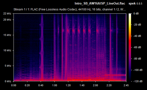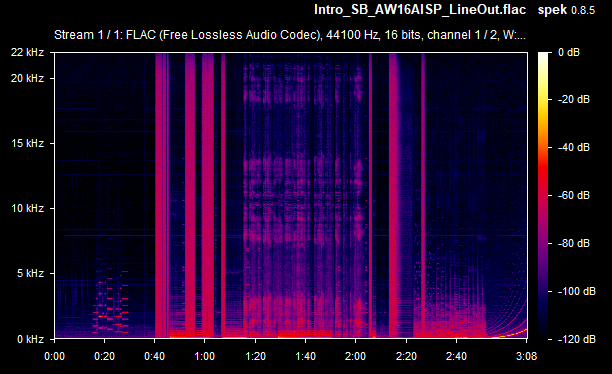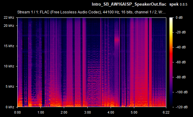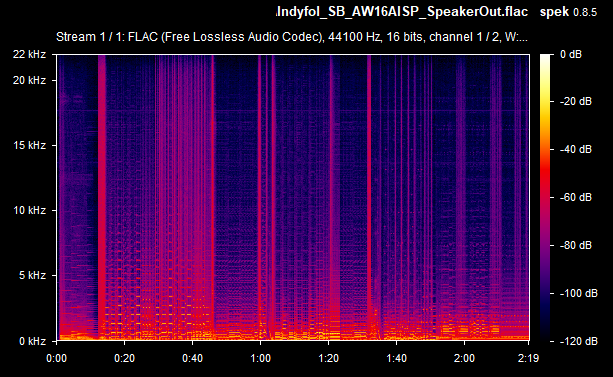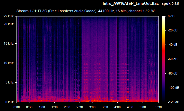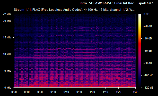 On average then, the card's weighted line-out SnR was a very respectable -67.4 dB, and the speaker-out SnR was also -67.4 dB. Some of the line-out SnRs seems to be calculated wrong (they would never typically be lower than the speaker-out SnR, as the onboard amplifier that drives the higher signal for speaker-out introduces more noise in the output) - I'll chalk this up to the slight differences between the two audio recordings (line-out recording vs speaker-out recording). The spectrograms tell you the real story, and using the line-out was, as expected, a noticeably lower volume since it's unamplified. Going forward, I will capture the same measurements with other sound cards for easier comparison.