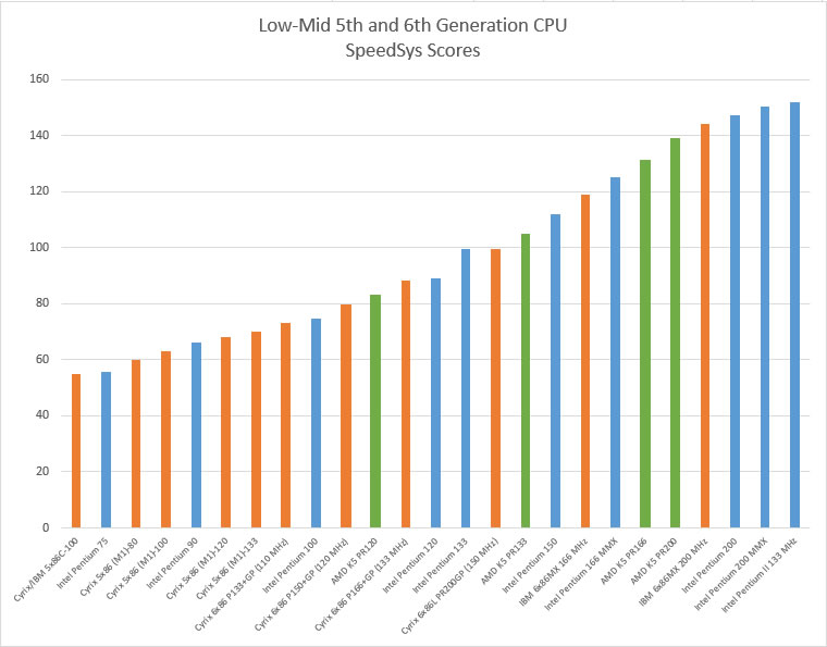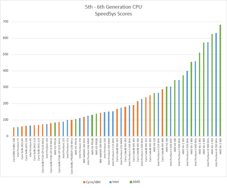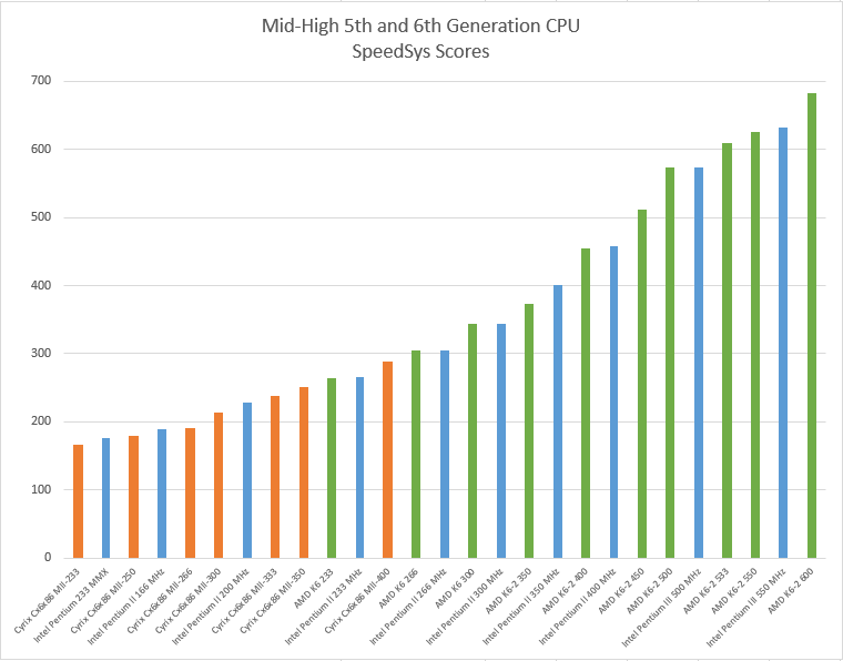 To provide some rough guidance on comparing 5th- and 6th-generation (Socket 7-era) CPUs, the charts below illustrate typical SpeedSys scores for a variety of processors from Intel, AMD and Cyrix. Since IBM, Texas Instruments and ST were authorised rebrands of Cyrix processors, you can use the closest Cyrix chip for reference. I've split the results into low-to-mid range and mid-to-high range for better clarity. Alternatively, click here for the full image.