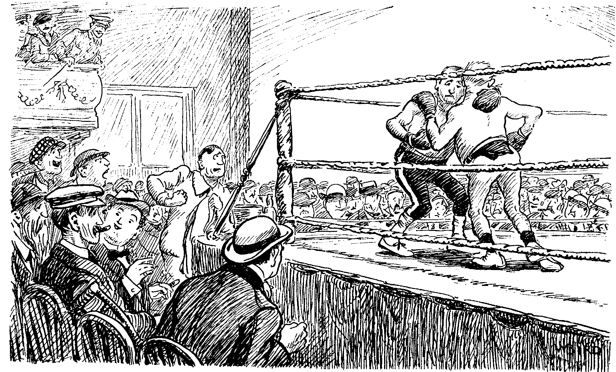 Witness after witness is called; barrister after barrister, in the bar beneath the dock rail, goes to sleep. WILLIAM, after shaking off the stupor caused by the awful disregard of his personality, begins to murmur incoherently. The warder taps him on the shoulder. WILLIAM, who has never even conceived of being tapped by anybody, bursts out with an exclamation. The worst thing which has ever happened to him in his life then happens. Bowdler, Bowdler of all the un-imperial and un-godlike people in this world, turns to WILLIAM to rebuke him in a stern whisper, telling him that he is doing himself no good and concluding his remarks with "My man"....