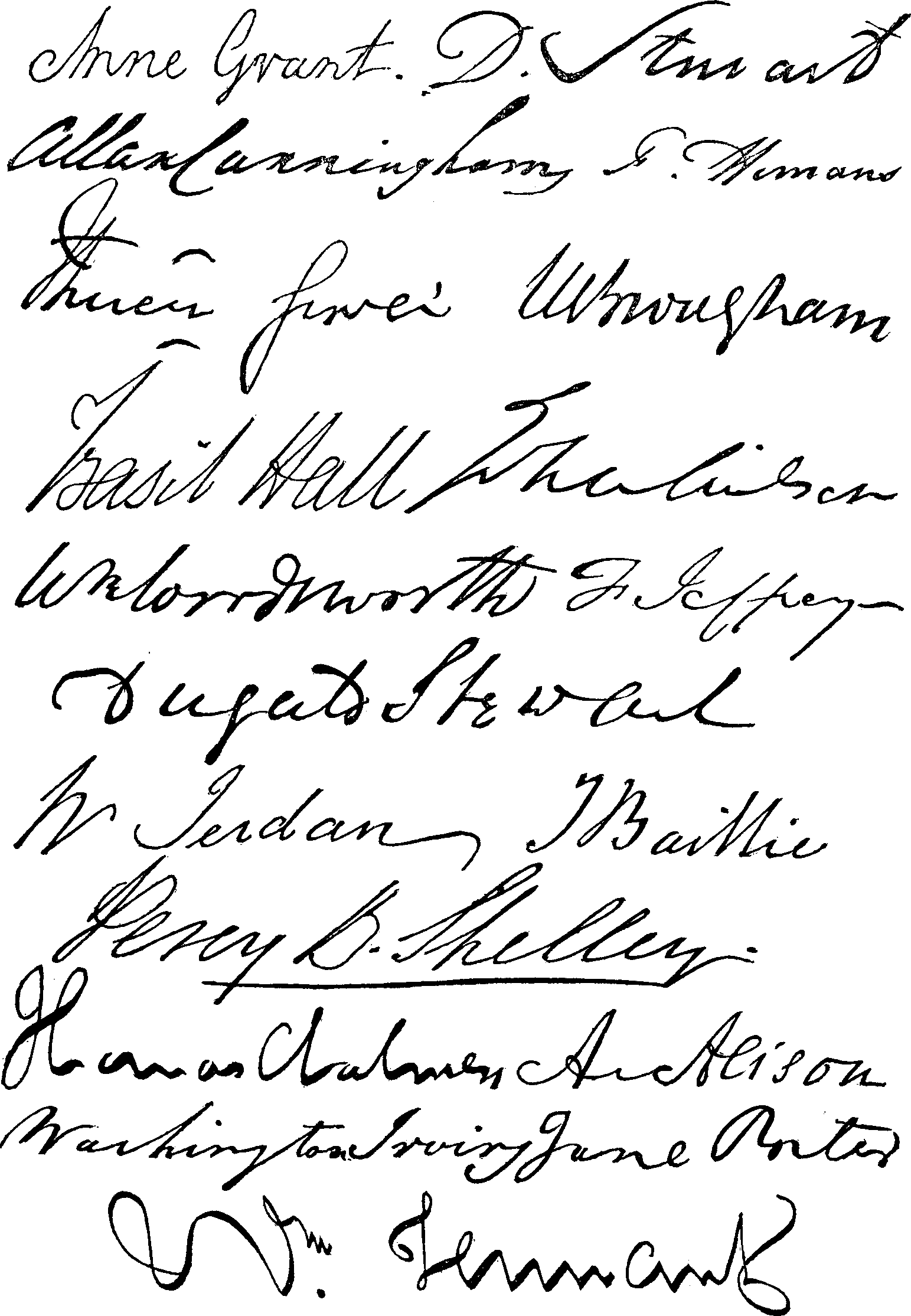 ANNE GRANT: "We have given Mrs. Grant of Laggan's present hand, in which may be discovered a little of the instability of advancing life; but there is a well-rounded breadth and distinctness in the formation of the letters, which seems to carry along with it evidence of the clear and judicious mind of the talented authoress of 'Letters from the Mountains.'"
