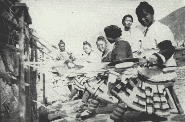 The people were suffering very much from the cold, and it struck me as one of the unaccountable phenomena of their civilization that in their ingenuity in using the gifts of Nature they have never learned to weave wool, and to employ it in clothing—that is, in a general sense. There are a few exceptions in the empire. The nation is almost entirely dependent upon cotton for clothing, which in winter is padded with a cheap wadding to an abnormal thickness. The common people wear no underclothing whatever. When they sleep they strip to the skin, and wrap themselves in a single wadded blanket, sleeping the sleep of the tired people their excessive labor makes them. And, although their clothes might be the height of discomfort, they show their famous indifference to comfort by never complaining. These burdensome clothes hang around them like so many bags, with the wide gaps here and there where the wind whistles to the flesh. It is a national characteristic that they are immune to personal inconveniences, a philosophy which I found to be universal, from the highest to the lowest.