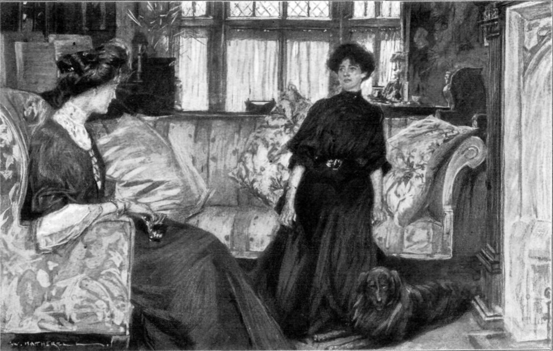She let in her dog, a fine collie, who was scratching at the door. As she stood before the fire, holding up a biscuit for him to jump at, she turned a red and conscious face towards her companion. The fire in the eyes, the smile on the lip seemed to say: