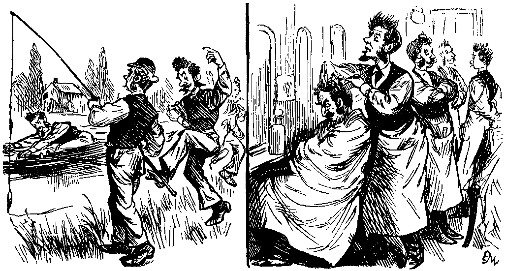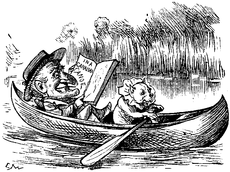 The Baron's Assistant Reader reports as follows to his chief—If you want a really refreshing book, a book whose piquant savour and quaint originality of style are good for jaded brains, buy and read In a Canadian Canoe by BARRY PAIN, the sixth volume of the Whitefriars Library of Wit and Humour (HENRY & Co.). Most of the stories and, I think, the best that go to make up this delightful volume have already appeared in The Granta, a Cambridge magazine, which London papers are accustomed to speak of as "our sprightly contemporary." They now seek and are sure to obtain a wider public and a more extended fame. There is in these stories a curious mixture of humour, insight and pathos, with here and there a dash of grimness and a sprinkling of that charming irrelevancy which is of the essence of true humour. Occasionally Mr. BARRY PAIN wings a shaft against the comfortably brutal doctrines of the average and orthodox householder, male or female. But on these occasions he uses the classical fables and the pagan deities as his bow, and the twang of his shot cannot offend those who play the part of target and are pierced. Read the four stories from the "Entertainments of Kapnides" in the "Canadian Canoe" series, or, "An Hour of Death," "The Last Straw," and "Number One Hundred and Three" in "The Nine Muses Minus One," and you will see at once what I mean. Then for run-away, topsy-turvey wit I think I would back "The Story of the Tin Heart" and "The Camel who never got Started," against most stories I know. Mr. BARRY PAIN's stories sometimes make me feel as if I had got hold of the key-handle of things which have hitherto been puzzles to me. I turn it, open the door ever so little to peep inside, and before I have taken a good square look, Mr. BARRY PAIN slams the door in my face, and I think I can hear him laughing on the other side at the bruise on my forehead. That's not kind treatment, but it promotes curiosity. As for "The Celestial Grocery," I can only say of it that it is in its way a masterpiece. Mr. PAIN sometimes gives way to a touch or two of sentiment, but he abstains from sloppiness. His book is not only witty and humorous but fresh and original in style. It is admirably written. His prose is good,—which is moderate praise, striking a balance between the pros and cons of criticism. Prosit! To all holiday-makers who like quaintness and fun touched with pathos and refinement, I say again, buy and read In a Canadian Canoe.