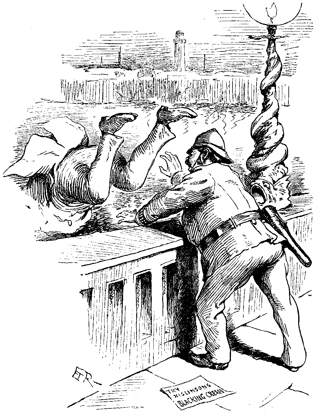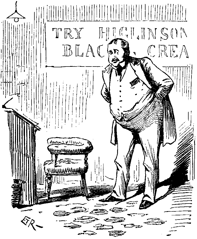 In one way this was very good for Mr. HIGLINSON, because he became very rich; in other ways it was not so good for him. For a long time he had nothing to do with public life; the public never thought about his existence; to the public he was not a man at all—he was only part of the name of the stuff they used for their boots. If he had introduced himself to a stranger, giving the name of HIGLINSON, it is probable that the stranger would have remarked jocularly, "No relation to the Blacking-cream, I presume?" HIGLINSON knew this, and it pained him deeply, for he was a sensitive man.