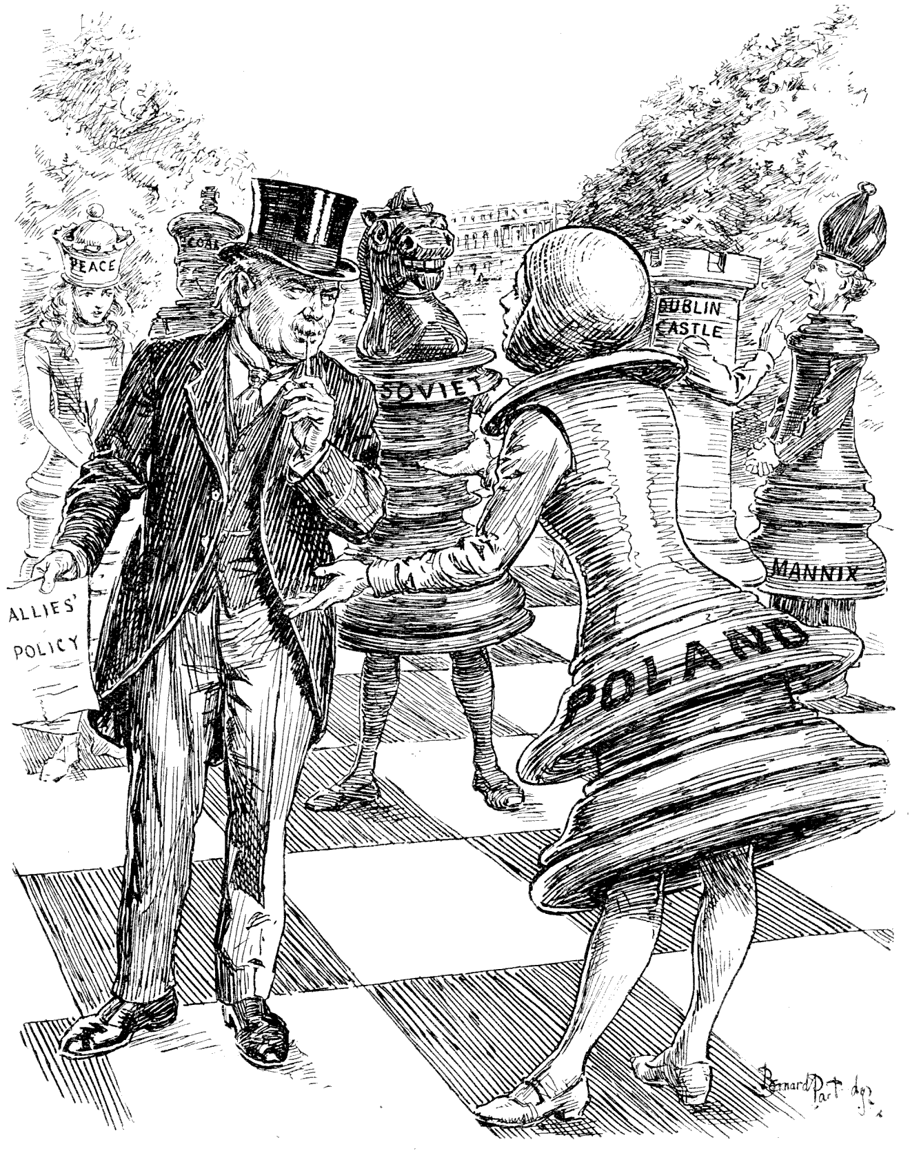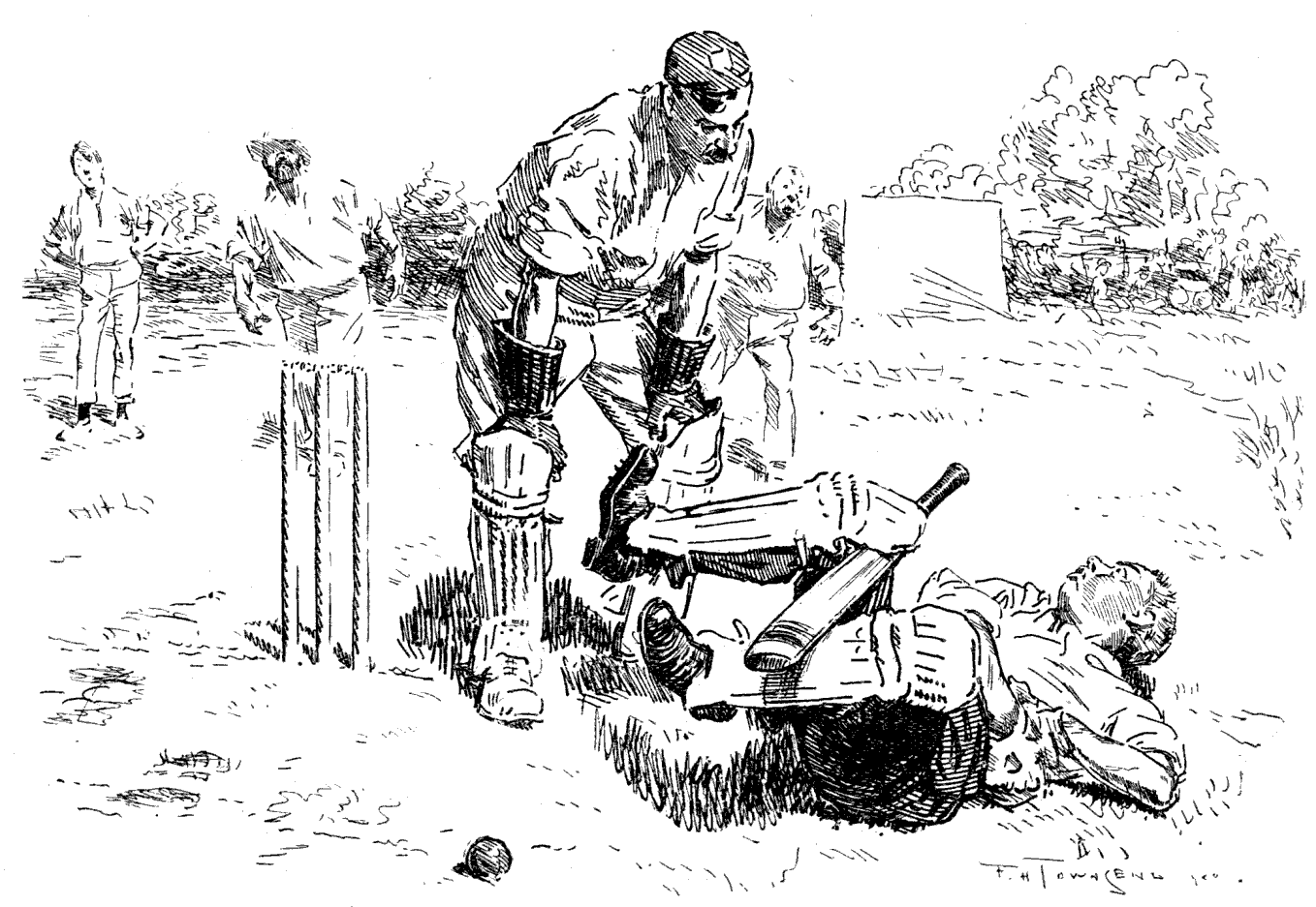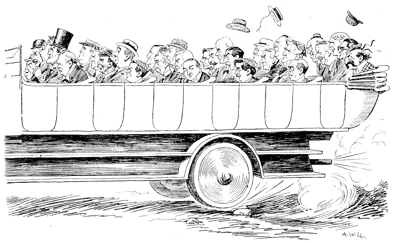 Grogtown.—All available accommodation has been monopolised by Glasborough visitors, among whom this resort is becoming more alarmingly popular every year. Sixty charabancs arrived on Monday and the Riot Act was read several times before the passengers could be induced to desist from their badinage of the residents, most of whom have since retired behind the wire-entanglements at Kelrose. The municipal orchestra was subjected to a brisk fusillade of rock-cakes on Saturday night; the conductor and several of the instrumentalists suffered contusions, and their performances have since been discontinued. This has not unnaturally given rise to a certain amount of dissatisfaction amongst the visitors, but otherwise there has been no recrudescence of rioting. A company of the Caithness Highlanders, with machine-guns, are now encamped on the links, and sunshine is all that is needed to complete the success of the season.