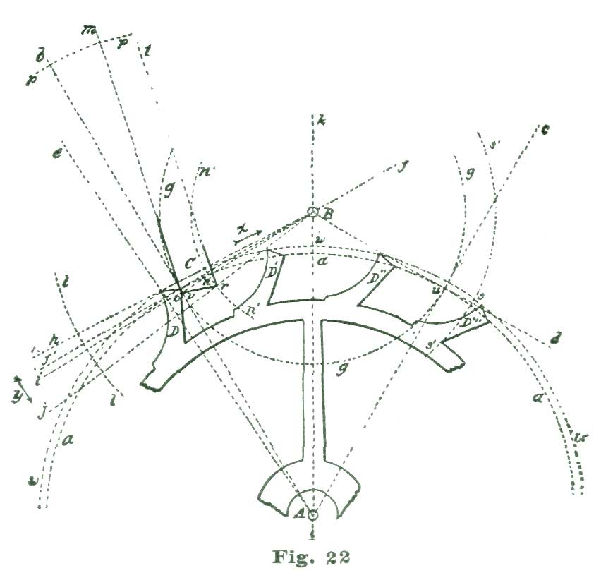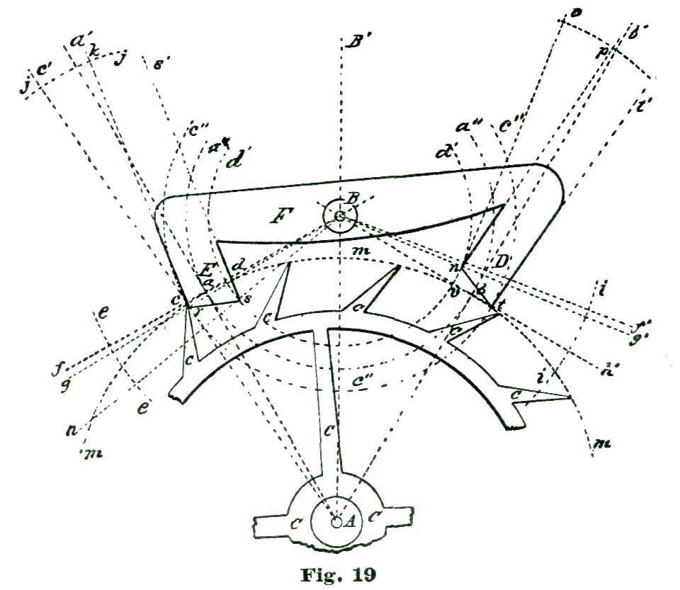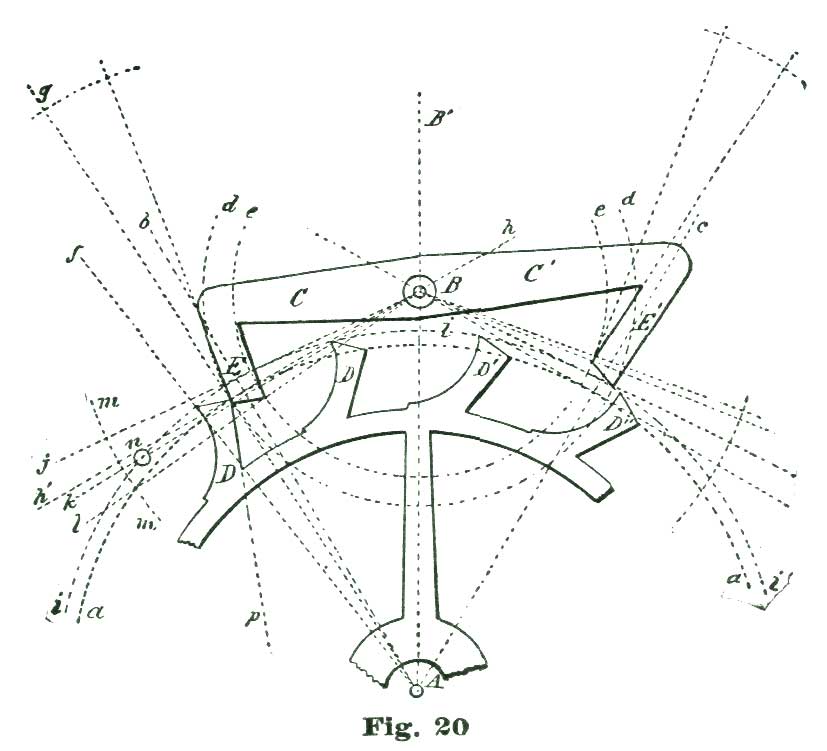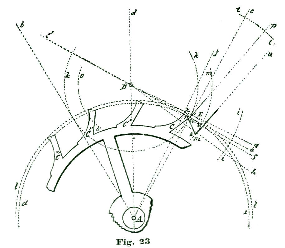 In this case the power conveyed from the mainspring to the escape wheel is to be conveyed to the lever, and by the lever transmitted to the balance. We know it is the usual plan adopted by text-books to lay down a certain formula for drawing an escapement, leaving the pupil to work and reason out the principles involved in the action. In the plan we have adopted we propose to induct the reader into the why and how, and point out to him the rules and methods of analysis of the problem, so that he can, if required, calculate mathematically exactly how many grains of force the fork exerts on the jewel pin, and also how much (or, rather, what percentage) of the motive power is lost in various "power leaks," like "drop" and lost motion. In the present case the mechanical result we desire to obtain is to cause our lever pivoted at k to vibrate back and forth through an arc of eight and one-half degrees; this lever not only to vibrate back and forth, but also to lock and hold the escape wheel during a certain period of time; that is, through the period of time the balance is performing its excursion and the jewel pin free and detached from the fork.