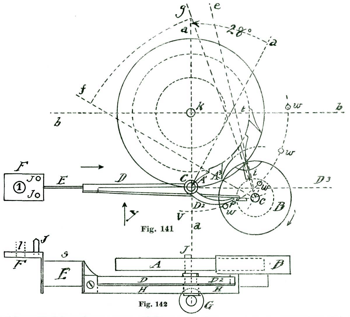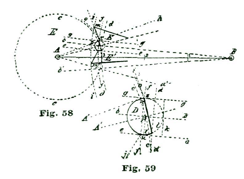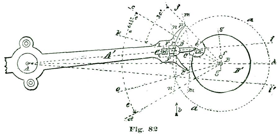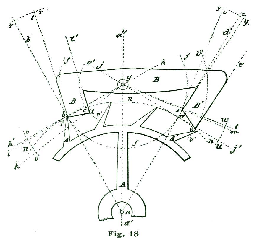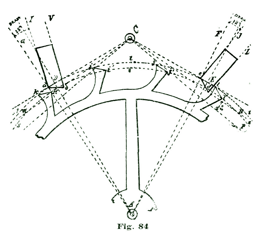 In this case the power conveyed from the mainspring to the escape wheel is to be conveyed to the lever, and by the lever transmitted to the balance. We know it is the usual plan adopted by text-books to lay down a certain formula for drawing an escapement, leaving the pupil to work and reason out the principles involved in the action. In the plan we have adopted we propose to induct the reader into the why and how, and point out to him the rules and methods of analysis of the problem, so that he can, if required, calculate mathematically exactly how many grains of force the fork exerts on the jewel pin, and also how much (or, rather, what percentage) of the motive power is lost in various "power leaks," like "drop" and lost motion. In the present case the mechanical result we desire to obtain is to cause our lever pivoted at k to vibrate back and forth through an arc of eight and one-half degrees; this lever not only to vibrate back and forth, but also to lock and hold the escape wheel during a certain period of time; that is, through the period of time the balance is performing its excursion and the jewel pin free and detached from the fork.