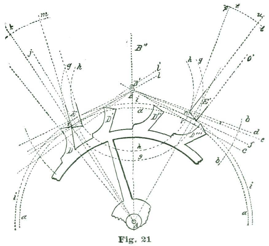 From the intersection of the line f e with the arc i we lay off eight and one-half degrees, and through this point draw the line e h. Bear in mind that we are drawing the pallet at B to represent one with eight and one-half degrees fork-and-pallet action, and with equidistant lockings. If we reason on the matter under consideration, we will see the tooth A and the pallet B, against which it acts, part or separate when the tooth arrives at the point c; that is, after the escape wheel has moved through ten and one-half degrees of angular motion, the tooth drops from the impulse face of the pallet and falls through one and one-half degrees of arc, when the tooth A'', Fig. 10, is arrested by the exit pallet.