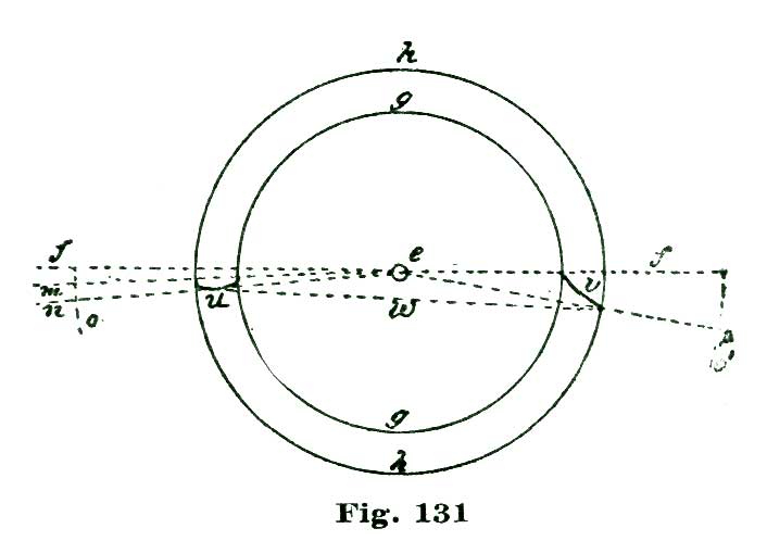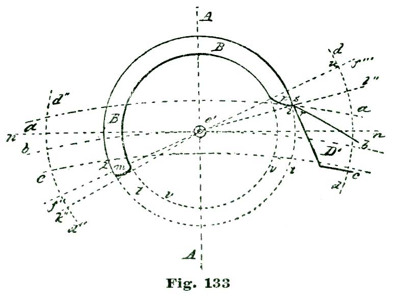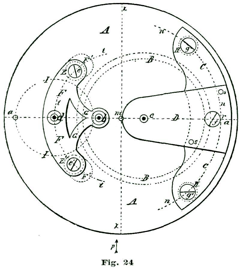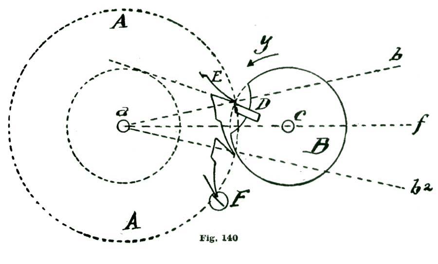 We now come to the consideration of the pallets and how to delineate them. To this we shall add a careful analysis of their action. Let us, before proceeding further, "think a little" over some of the factors involved. To aid in this thinking or reasoning on the matter, let us draw the heavy arc l extending from a little inside of the circle n at f to the circle n at e. If now we imagine our escape wheel to be pressed forward in the direction of the arrow j, the tooth D would press on the arc l and be held. If, however, we should revolve the arc l on the center k in the direction of the arrow i, the tooth D would escape from the edge of l and the tooth D'' would pass through an arc (reckoning from the center p) of twelve degrees, and be arrested by the inside of the arc l at e. If we now should reverse the motion and turn the arc l backward, the tooth at e would, in turn, be released and the tooth following after D (but not shown) would engage l at f. By supplying motive to revolve the escape wheel (E) represented by the circle n, and causing the arc l to oscillate back and forth in exact intervals of time, we should have, in effect, a perfect escapement. To accomplish automatically such oscillations is the problem we have now on hand.