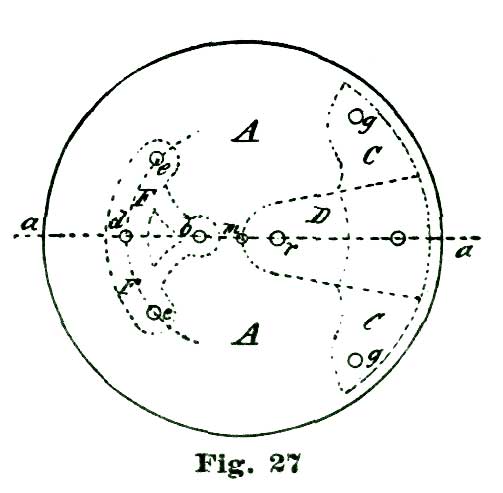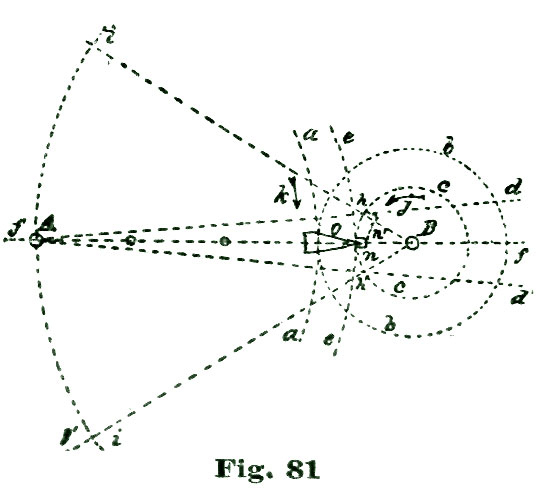 In clocks, the back-and-forth movement, or oscillating motion, is obtained by employing a pendulum; in a movable timepiece we make use of an equally-poised wheel of some weight on a pivoted axle, which device we term a balance; the vibrations or oscillations being obtained by applying a coiled spring, which was first called a "pendulum spring," then a "balance spring," and finally, from its diminutive size and coil form, a "hairspring." We are all aware that for the motive power for keeping up the oscillations of the escaping circle l we must contrive to employ power derived from the teeth D of the escape wheel. About the most available means of conveying power from the escape wheel to the oscillating arc l is to provide the lip of said arc with an inclined plane, along which the tooth which is disengaged from l at f to slide and move said arc l through—in the present instance an arc of eight and one-half degrees, during the time the tooth D is passing through ten and one-half degrees. This angular motion of the arc l is represented by the radial lines k f' and k r, Fig. 8. We desire to impress on the reader's mind the idea that each of these angular motions is not only required to be made, but the motion of one mobile must convey power to another mobile.