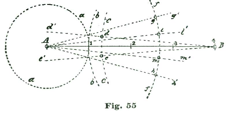 Before we take up the details of drawing an escapement we will say a few words about "degrees," as this seems to be something difficult to understand by most pupils in horology when learning to draw parts of watches to scale. At Fig. 2 we show several short arcs of fifteen degrees, all having the common center g. Most learners seem to have an idea that a degree must be a specific space, like an inch or a foot. Now the first thing in learning to draw an escapement is to fix in our minds the fact that the extent of a degree depends entirely on the radius of the arc we employ. To aid in this explanation we refer to Fig. 2. Here the arcs c, d, e and f are all fifteen degrees, although the linear extent of the degree on the arc c is twice that of the degree on the arc f. When we speak of a degree in connection with a circle we mean the one-three-hundred-and-sixtieth part of the periphery of such a circle. In dividing the arcs a a and b b we first divide them into six spaces, as shown, and each of these spaces into ten minor spaces, as is also shown. We halve five of the degree spaces, as shown at h. We should be very careful about making the degree arcs shown at Fig. 1, as the accuracy of our drawings depends a great deal on the perfection of the division on the scale A. In connection with such a fixed scale of degrees as is shown at Fig. 1, a pair of small dividers, constantly set to a degree space, is very convenient.