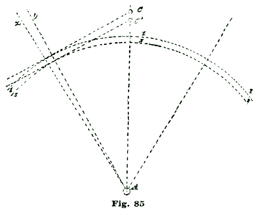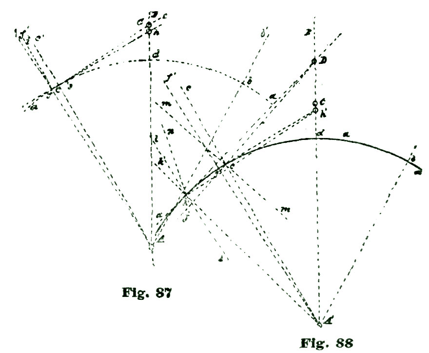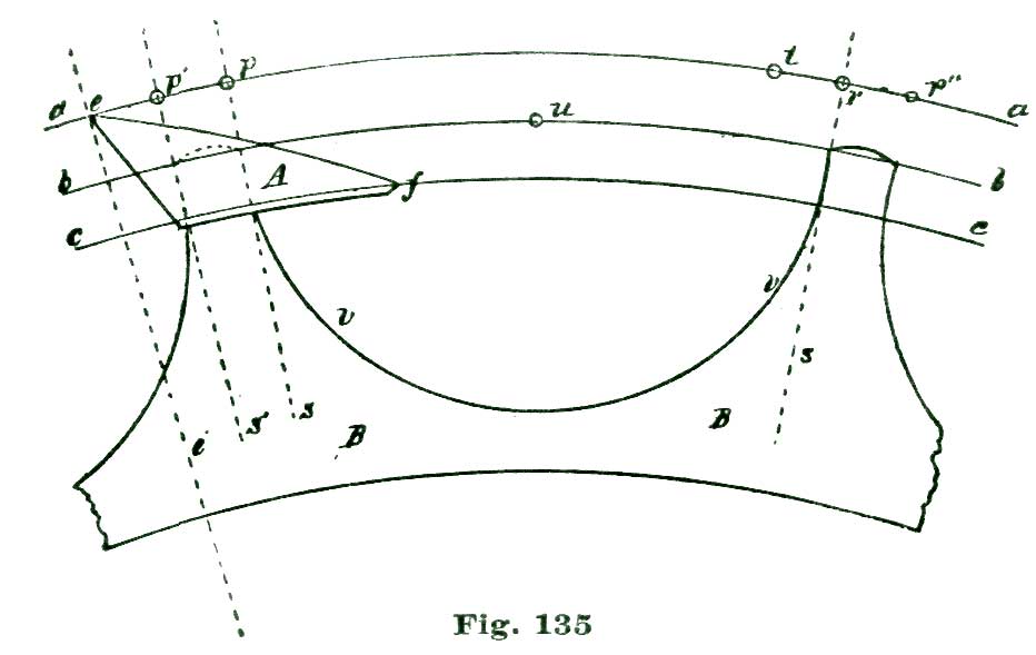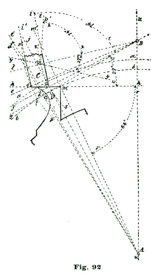 To locate the position of the inner angle of the pallet B, sweep the short arc l by setting the dividers so one point or leg rests at the center e and the other at the point c. Somewhere on this arc l is to be located the inner angle of our pallet. In delineating this angle, Moritz Grossman, in his "Prize Essay on the Detached Lever Escapement," makes an error, in Plate III of large English edition, of more than his entire lock, or about two degrees. We make no apologies for calling attention to this mistake on the part of an authority holding so high a position on such matters as Mr. Grossman, because a mistake is a mistake, no matter who makes it.