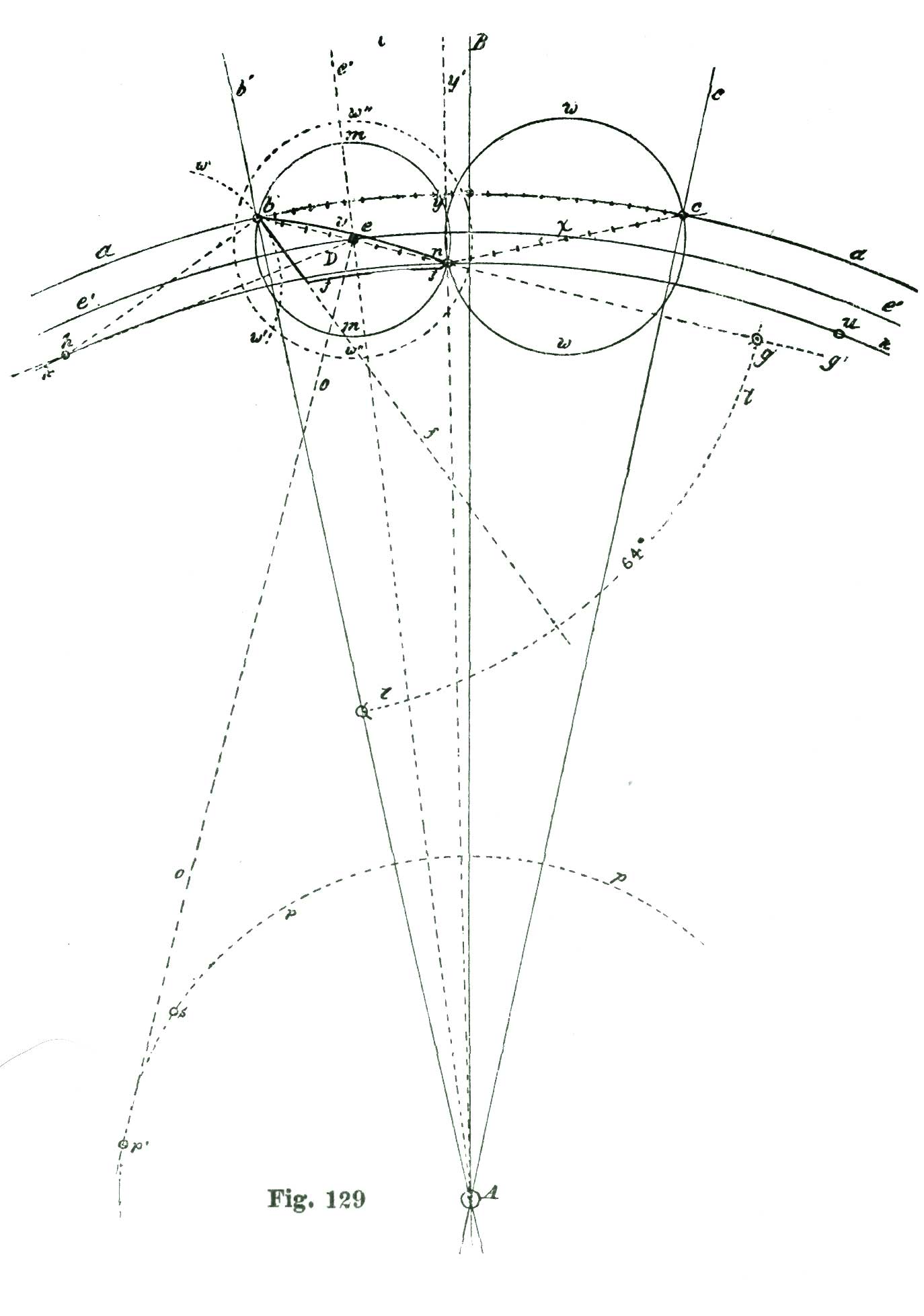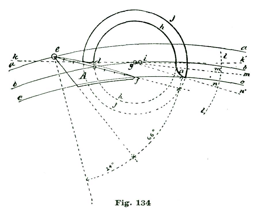 From the point e, which represents the center of the pallet staff, we draw through b the line e f. At one degree below e f we draw the line e g, and seven and one-half degrees below the line e g we draw the line e h. For delineating the lines e g, etc., correctly, we employ a degree-arc; that is, on the large drawing we are making we first draw the line e b f, Fig. 10, and then, with our dividers set at five inches, sweep the short arc i, and on this lay off first one degree from the intersection of f e with the arc i, and through this point draw the line e g.