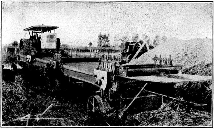 The stalks are fed sidewise in a continuous layer 2 to 3 inches thick,