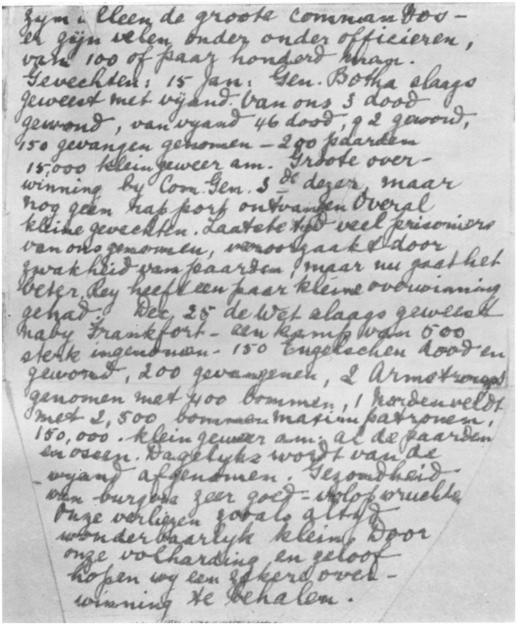 The greater part of the narrative comes from a diary kept during the war with unusual fullness and vividness. The difficulty experienced by the writer of the diary in communicating to friends outside Pretoria information about what was passing inside, and in unburdening herself of the feelings roused in her by the events of the war, made the diary more than usually intimate. To understand fully many of the narratives which have been transferred from it to this book, it must be remembered that one is reading, not something written from memory years after the event, but rather the record of a conversation at the time, in which the diarist is describing the events as if to a friend who shares to the full all her own feelings and to whom she can speak without reserve.