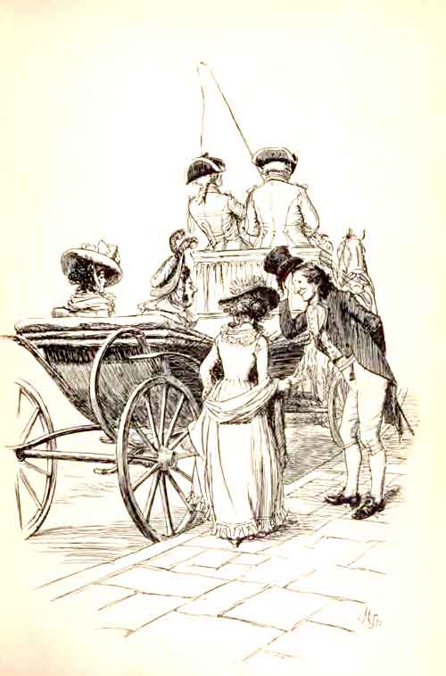 Of local colouring there is as little in Sense and Sensibility as in Pride and Prejudice. It is not unlikely that some memories of Steventon may survive in Norland; and it may be noted that there is actually a Barton Place to the north of Exeter, not far from Lord Iddesleigh's well-known seat of Upton Pynes. It is scarcely possible, also, not to believe that, in Mrs. Jennings's description of Delaford—'a nice place, I can tell you; exactly what I call a nice old-fashioned place, full of comforts and conveniences; quite shut in with great garden walls that are covered with the best fruit-trees in the country; and such a mulberry tree in one corner!'—Miss Austen had in mind some real Hampshire or Devonshire country house. In any case, it comes nearer a picture than what we usually get from her pen. 'Then there is a dovecote, some delightful stew-ponds, and a very pretty canal; and everything, in short, that one could wish for; and, moreover,[xiv] it is close to the church, and only a quarter of a mile from the turnpike-road, so 'tis never dull, for if you only go and sit up in an old yew arbour behind the house, you may see all the carriages that pass along.' The last lines suggest those quaint 'gazebos' and alcoves, which, in the coaching days, were so often to be found perched at the roadside, where one might sit and watch the Dover or Canterbury stage go whirling by. Of genteel accomplishments there is a touch In the 'landscape in coloured silks' which Charlotte Palmer had worked at school (chap, xxvi.); and of old remedies for the lost art of swooning, in the 'lavender drops' of chapter xxix. The mention of a dance as a 'little hop' in chapter ix. reads like a premature instance of middle Victorian slang. But nothing is new—even in a novel—and 'hop,' in this sense, is at least as old as Joseph Andrews.
