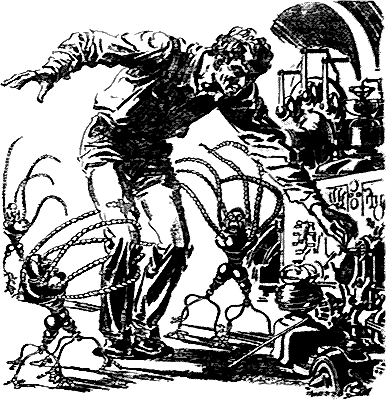 Abruptly the giant stooped, and Phobar shrank back, but a flowing mass of cold, insensate metal swept around him, lifted him fifty feet in the air. Dizzy, sick, horrified, he was hardly conscious of the whirlwind motion into which the giant suddenly shot. He had a dim impression of machines racing by, of countless other giants, of a sudden opening in the walls of the immense building, and then a rush across the surface of metal land. Even in his vertigo he had enough curiosity to marvel that there was no vegetation, no water, only the dull black metal everywhere. Yet there was air.