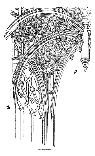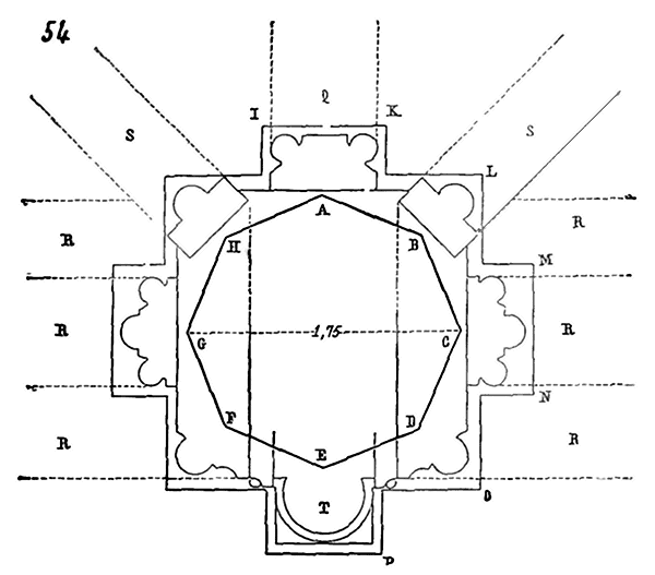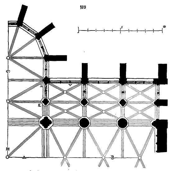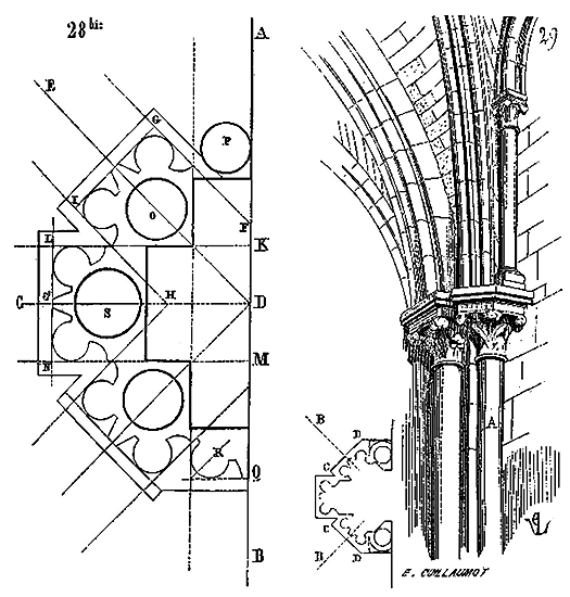 Dès lors les arêtes diagonales devaient prendre leur point de départ en retraite de la saillie des piles ou colonnes, celles-ci étant uniquement destinées à porter les arcs doubleaux, c'est-à-dire (9) que les arêtes durent partir des points F au lieu de partir des points G, et que les sommiers des arcs doubleaux se reposèrent sur les assiettes F H G I. Lorsqu'il s'agissait donc de fermer les voûtes, les constructeurs posaient les couchis portant les massifs ou formes en terre sur l'extrados de ces arcs doubleaux et sur les deux cintres diagonaux en charpente.