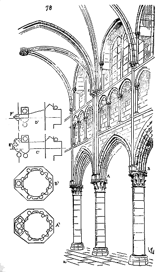 Le résultat de ces tâtonnements fut que les voûtes d'arêtes n'étaient plus des pénétrations de cylindres ou de cônes, mais d'ellipsoïdes. La première difficulté étant franchie, des perfectionnements rapides ne devaient pas tarder à se développer. Mais d'abord, comment, par quels procédés mécaniques ces voûtes étaient-elles construites? La voûte d'arête romaine, construite par travées, n'avait point d'arcs doubleaux: elle portait sur des piles ou des colonnes saillantes, ainsi que le représente la fig. 7, c'est-à-dire (voy. la projection horizontale A d'une de ces voûtes) que les diagonales B C, D E, produites par la pénétration de deux demi-cylindres de diamètres égaux et formant arêtes saillantes, portaient sur angles saillants des piles. Mais les architectes romans ayant d'abord renforcé les grandes voûtes en berceau par des arcs doubleaux, ainsi que fait voir notre fig. 3, et venant à remplacer ces voûtes demi-cylindriques par des voûtes d'arêtes barlongues, conservèrent les arcs doubleaux; ils ne pouvaient faire autrement, puisque les diagonales de ces voûtes étaient des demi-cercles et que leur sommet s'élevait au-dessus du sommet des arcs dont le diamètre était donné par l'écartement des piles.
