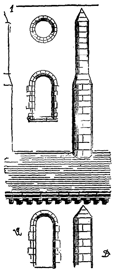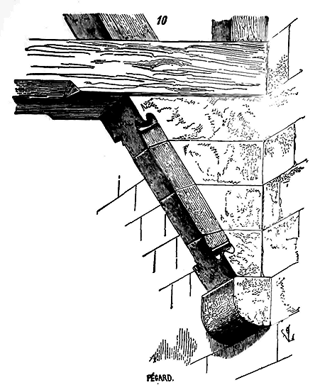 Notre fig. 2 donne une idée de ce genre de construction. Afin de relier les diverses parties des bâtisses, de chaîner les murs dans leur longueur, ils noyèrent dans les massifs, à différentes hauteurs, sous les appuis des fenêtres, au-dessous des corniches, des pièces de bois longitudinales, ainsi que nous l'avons figuré en A (voy. CHAÎNAGE). Dans ces constructions, la pierre est économisée autant que faire se peut; aucun morceau ne présente d'évidements: tous sont posés en besace; ce n'est qu'un revêtement exécuté d'ailleurs avec le plus grand soin; non-seulement les parements sont layés, mais aussi les lits et les joints, et ces pierres sont posées à cru sans mortier, comme l'appareil romain.