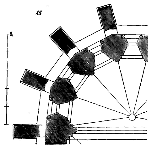 Cependant les constructeurs que Charlemagne fit venir de Lombardie et d'Orient en Occident n'apportèrent pas avec eux ce mode de construction; ils se contentèrent d'élever, comme à Aix-la-Chapelle, des voûtes à base octogonale ou circulaire sur des tambours montant de fond. Ce ne fut que plus tard que les dérivés de la construction byzantine eurent une influence directe en Occident. Quant aux méthodes de bâtir des constructeurs carlovingiens, elles se rapprochaient des méthodes romaines, c'est-à-dire qu'elles consistaient en des massifs de blocages enfermés dans des parements de brique, de moellon ou de pierre, ou encore de moellons alternant avec des assises de brique, le tout maintenu par des joints épais de mortier, ainsi que le fait voir la fig. 1.