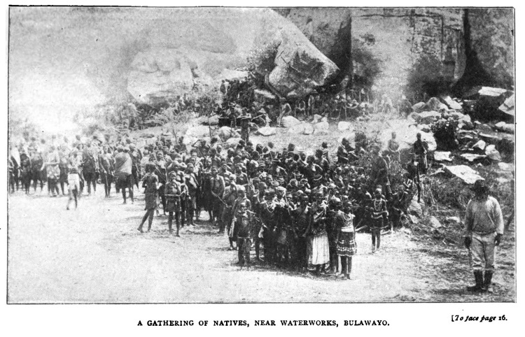 On the morning of November 4 we saw as we looked out of the carriage that the country was a continuation of that of the previous day. It was still as level, apparently, as a billiard table. We were drawing near to Bulawayo—were, in fact, due there about 9 a.m. We had been led to expect a more tropical vegetation, but as yet, though we were only sixty miles off, we saw no signs of it, but rather a return to the thorn bush of the Karroo and Southern Bechuanaland. One variation we noted, the rocky kopje is more frequent. These curious hill-heaps of rock are remnants of the primeval tableland that rose above the present face of the country from 100 to 300 feet. The sight of these curious kopjes deepened the idea that the seat of the “Killer,” Lo Bengula, would be found on a high eminence, protected by a cluster of these kopjes, but we looked long in vain for such a cluster of hills. Even the sight of a lordly tree would be welcomed, for the tame landscape was growing monotonous. The absence of scenery incidents did not diminish our friendly sympathies towards Rhodesia, and we made the most of what was actually visible, the blue sky, the dwarf trees, the low green herbage which dotted the ground in the midst of wide expanses of tawdiness, the burnt grass tussocks, which we knew would in a few days be covered as with a carpet of green. We see the land just before the season changes, and signs of vivifying spring approaching are abundant. A few days ago the first rains set in. The last two nights have witnessed a wonderful exhibition of electric display in the heavens, and severe thunderstorms have followed. In another fortnight it is said the plains will have become like a vast garden.