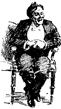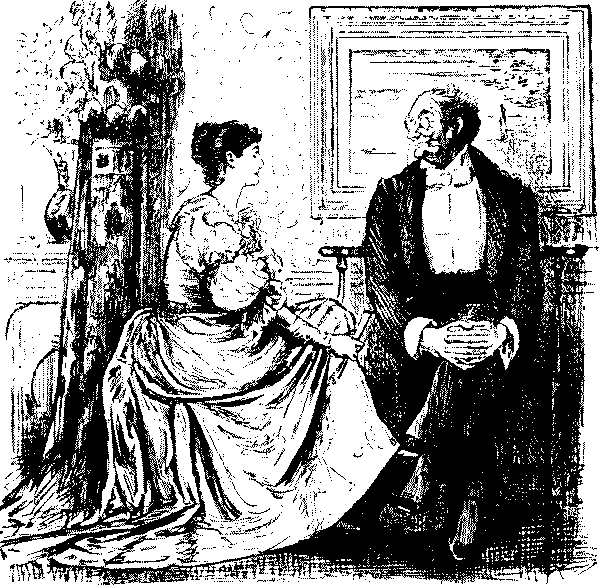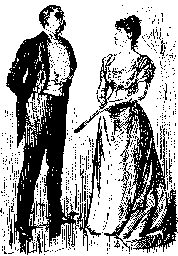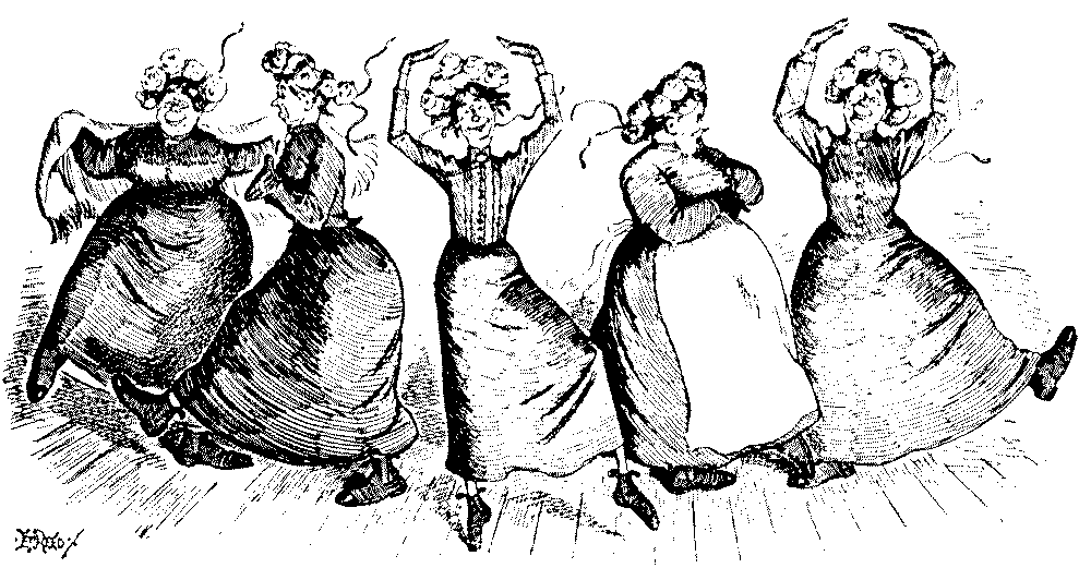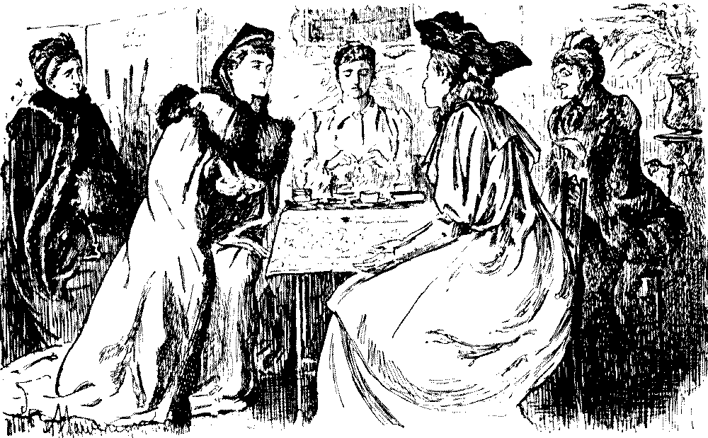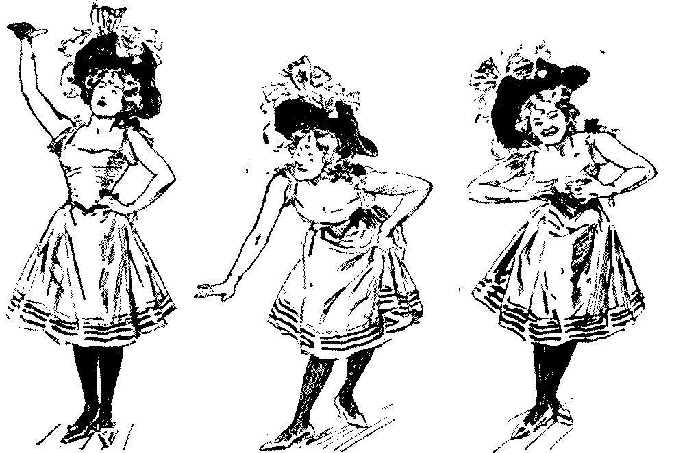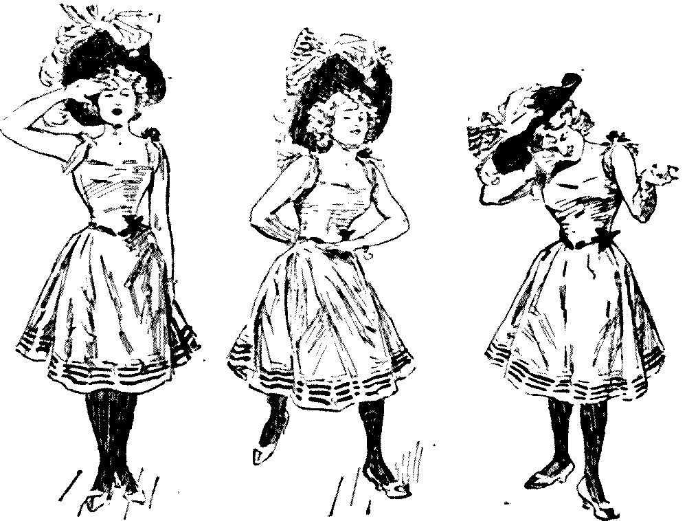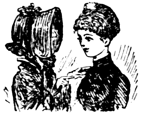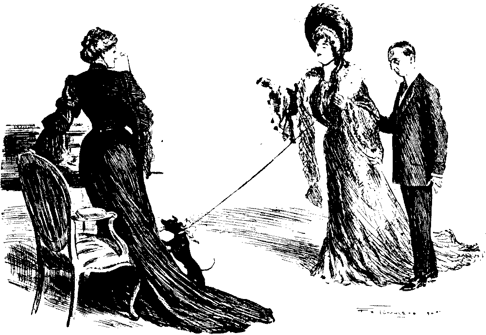 "The other night, at the Novelty Theatre, Mrs. Vere-Jones was gowned simply in a clinging black velvet, with a cloak of same handsomely trimmed with ermine."—Extract from Society Journal.