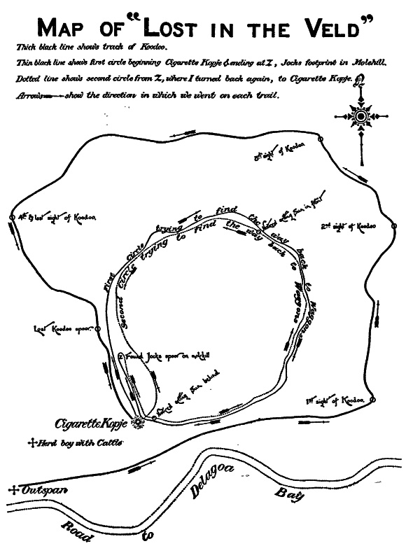 It was too early for loads in the Bay, so we moved slowly and hunted on the way, sometimes camping for several days in places where grass and water were good; and that lion skin was the cause of many disappointments to me. Never a bush or ant-heap, never a donga or a patch of reeds, did I pass for many days after that without the conviction that something was lurking there. Game there was in plenty, no doubt, but it did not come my way. Days went by with, once or twice, the sight of some small buck just as it disappeared, and many times, the noise of something in the bush or the sound of galloping feet. Others brought their contributions to the pot daily, and there seemed to be no reason in the world why I alone should fail—no reason except sheer bad luck! It is difficult to believe you have made mistakes when you do not know enough to recognise them, and have no extent your own ignorance; and then bad luck is such an easy and such a flattering explanation! If I did not go so far on the easy road of excuse-making as to put all the failures down to bad luck, perhaps some one else deserves the credit.