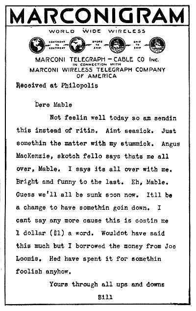 It kind of makes me restless Mable when I think of you and Main St. and the fello with the long hair in Billings and Stover what used to make us up Sundays. An I get lonesome for Maple st. with you an me sittin at one end of the piazza pretendin we was listenin to your father readin the newspaper out loud. If I ever get old, Mable, dont let me read the newspaper out loud. An do you remember how still wed have to sit sos the hammok wouldnt squak after eleven o'clock or your fatherd stick his head out the door [11]an say that if I didn't have a home you did? An how wed go canooing at Weewillo park Saturday nights and stay out till the fello that hired the boats out went to sleep. I was always a good spender. You know that, but thrifty. Thats me all over, Mable.