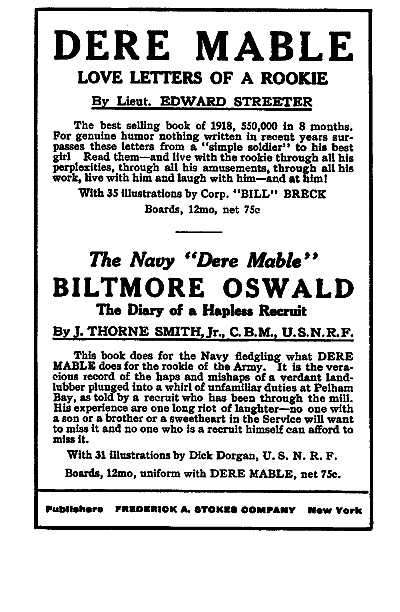 I had a run in with the Captin last week, Mable. I cant seem to get along with Captins. High strung. Thats me all over. Every week we[8] have an inspecshun and I have to clean the whole gun myself. They send the whole bunch down but I guess its just to hand me things. Like nurses in an operation. It aint much fun I tell you. When the Major came around next day he opened the little door in the back of the gun and I guess he saw how many parts there was to keep clean cause he says "My, what an awful bore." The Major is all right, Mable. He likes a fello to have a little fun once in a while. I guess he aint never been a Captin. I says "Yes, Major, it certainly is, an nobody knows it better than me cause I cleaned the whole thing myself." He says "Well if you dont do somethin about it next week then you wont have nobody to blame but yourself."