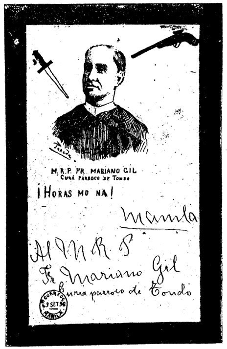 «The initiated were masked (79) as also was the person to be initiated; before a table was placed a skull and crossbones, a triangle and two candles; the person about to be initiated was told that the object of the Katipunan2 was the liberating of the Tagalog people, and the expulsion of the Spaniards from the archipelago, or their [41]destruction (80); following this, came a series of questions and replies in the which the martyrdom of Gomez, Burgos and Zamora (81), native priests judged and condemned for their part in the rebellion of Cavite in 1872 was exalted, and they passed on to the proofs (82) which consisted in imitating an assassination, a suicide, etc. This was followed by the taking of an oath of striving to effect the liberation of the people till death, an oath which demanded a blind obedience to the commands of the superior and the preservation of the secrets of the association under the pain of death (83). Finally, to terminate the ceremony, they made with a dagger especially adapted to that use, an incision in the arm of the person initiated and with the blood which flowed from the wound thus made, the new katipunero signed his compromise (see note 50.)