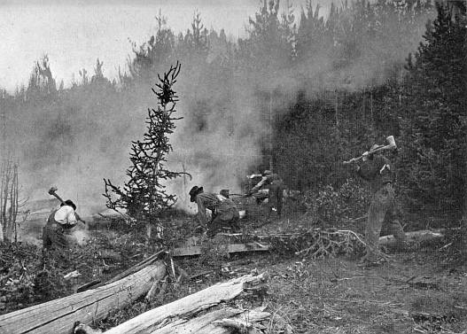 The Lumber Industry. Measured by the number of persons employed, lumbering is the country's largest manufacturing industry. In its 48,000 saw mills it employs more than 600,000 men. Its investment in these plants is over $1,000,000,000, and the investment in standing timber is $1,500,000,000 more. This industry furnishes[xv] the railroads a traffic income of over $200,000,000 annually. If we include in these statistics also the derived wood products, we find that over 1,000,000 wage earners are employed, and that the products and derived products are valued at over $2,000,000,000 annually. Most certainly we are dealing with a very large business enterprise.