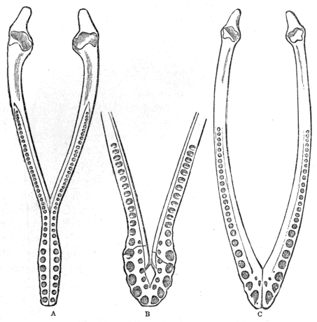 Of long and short-tailed Pterodactyles we now know almost complete skeletons and details of their patagia or flying membranes. The discovery of the long-tailed feathered bird with teeth—the Archæopteryx, from the Oolite of Solenhofen, is another marvellous addition to our knowledge; whilst Marsh’s great Hesperornis, a wingless diving bird with teeth, and his flying toothed bird, the Ichthyornis dispar, are to us equally surprising.